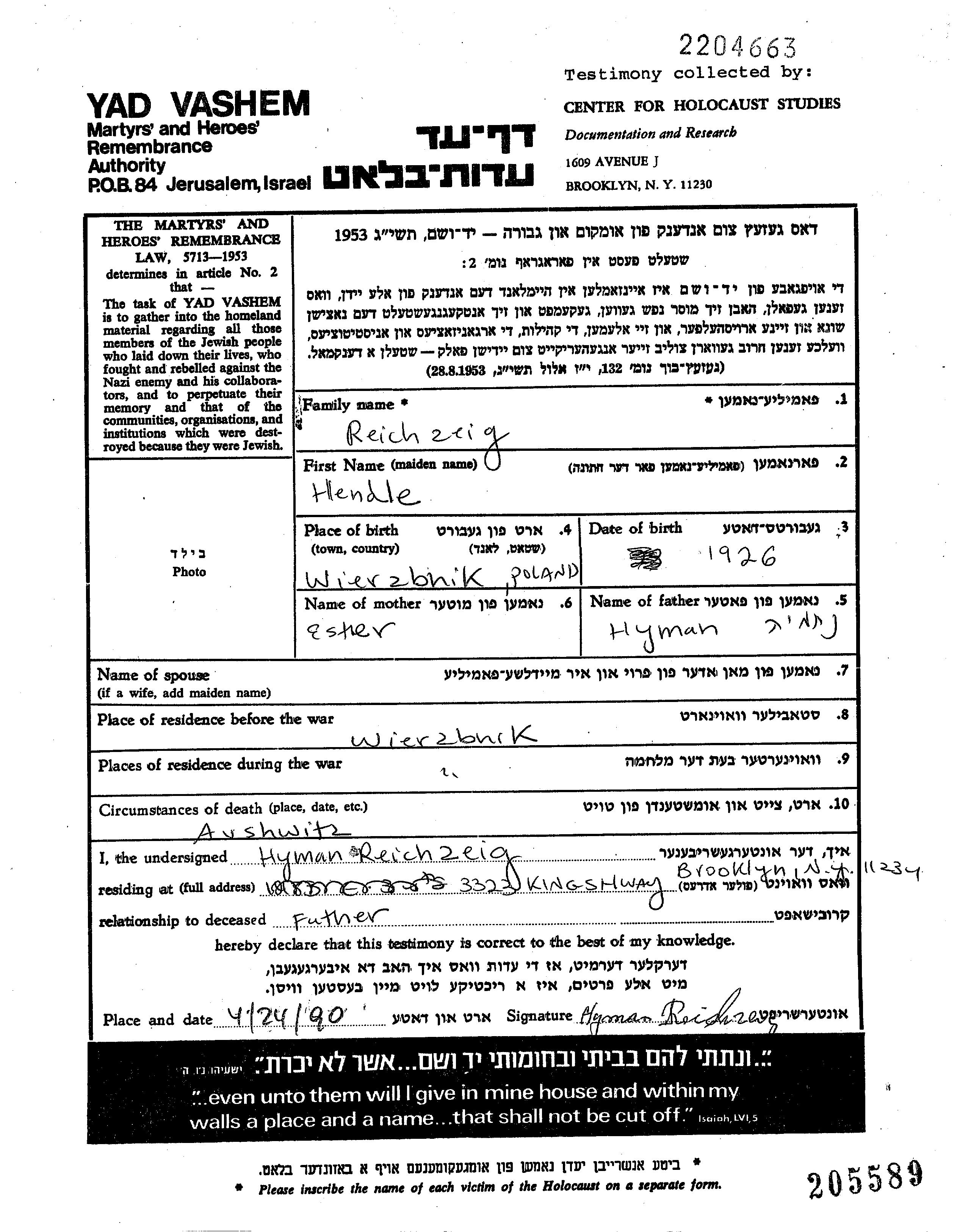 Хендле Хендель Райхцайг, место рождения: Вежбник, Польша. Отец: Нехемия Хейман, mать:Эстер, девичья фамилия Штейнхарт. Ребенок. Место жительства до войны: Вежбник, Польша. Место во время войны: Вежбник, Польша.