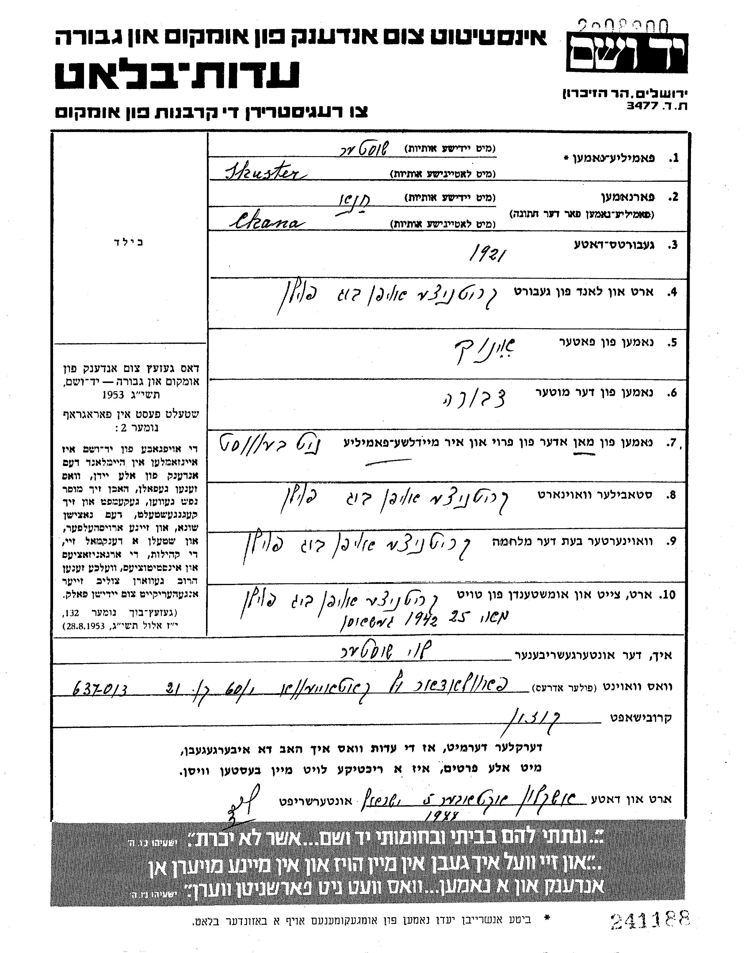 Шустер Хана Хона 1921 Корытница, Польша Лист свидетельских показаний
