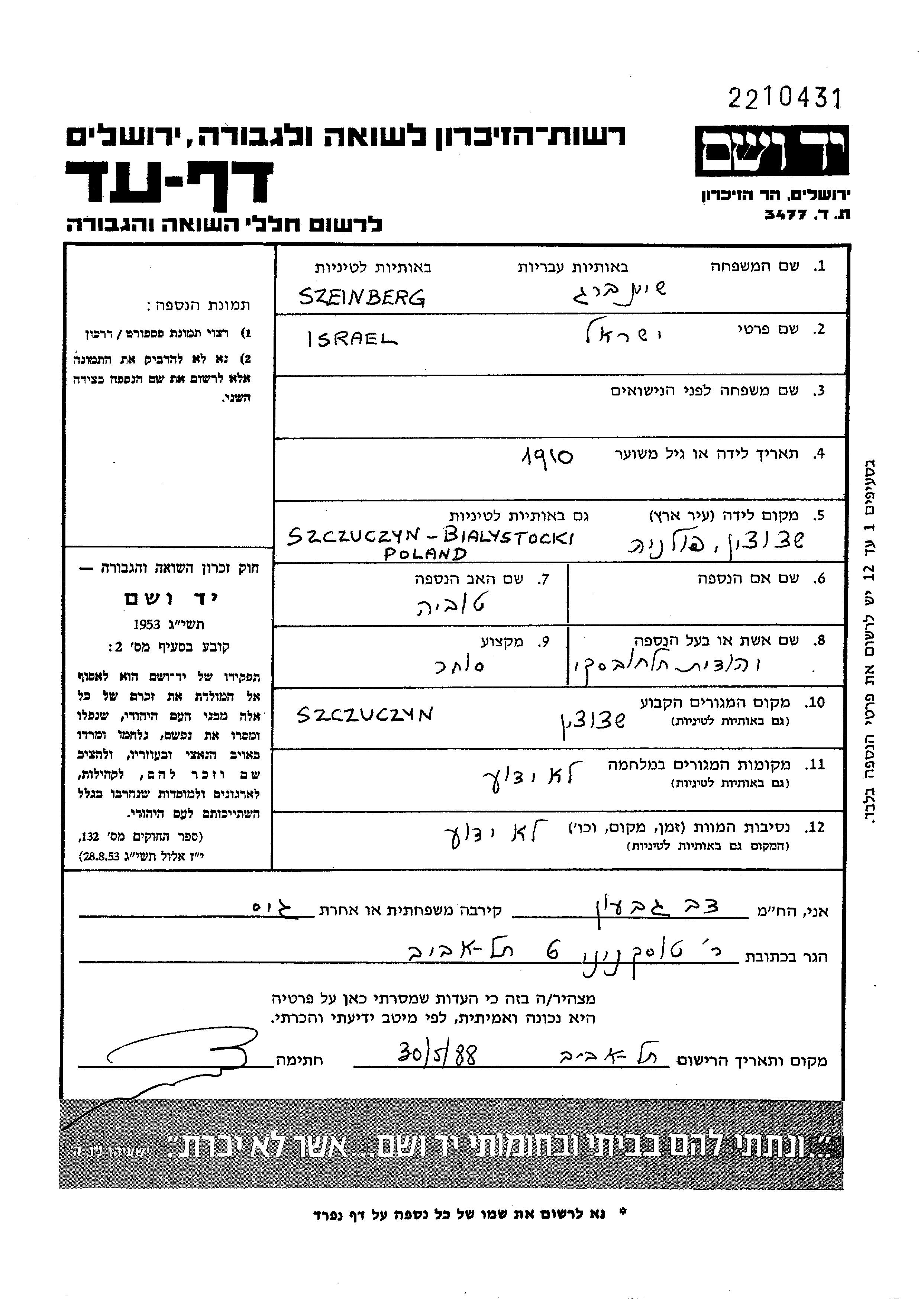 Шейнберг Исраэль 1910 Щучин, Польша Лист свидетельских показаний