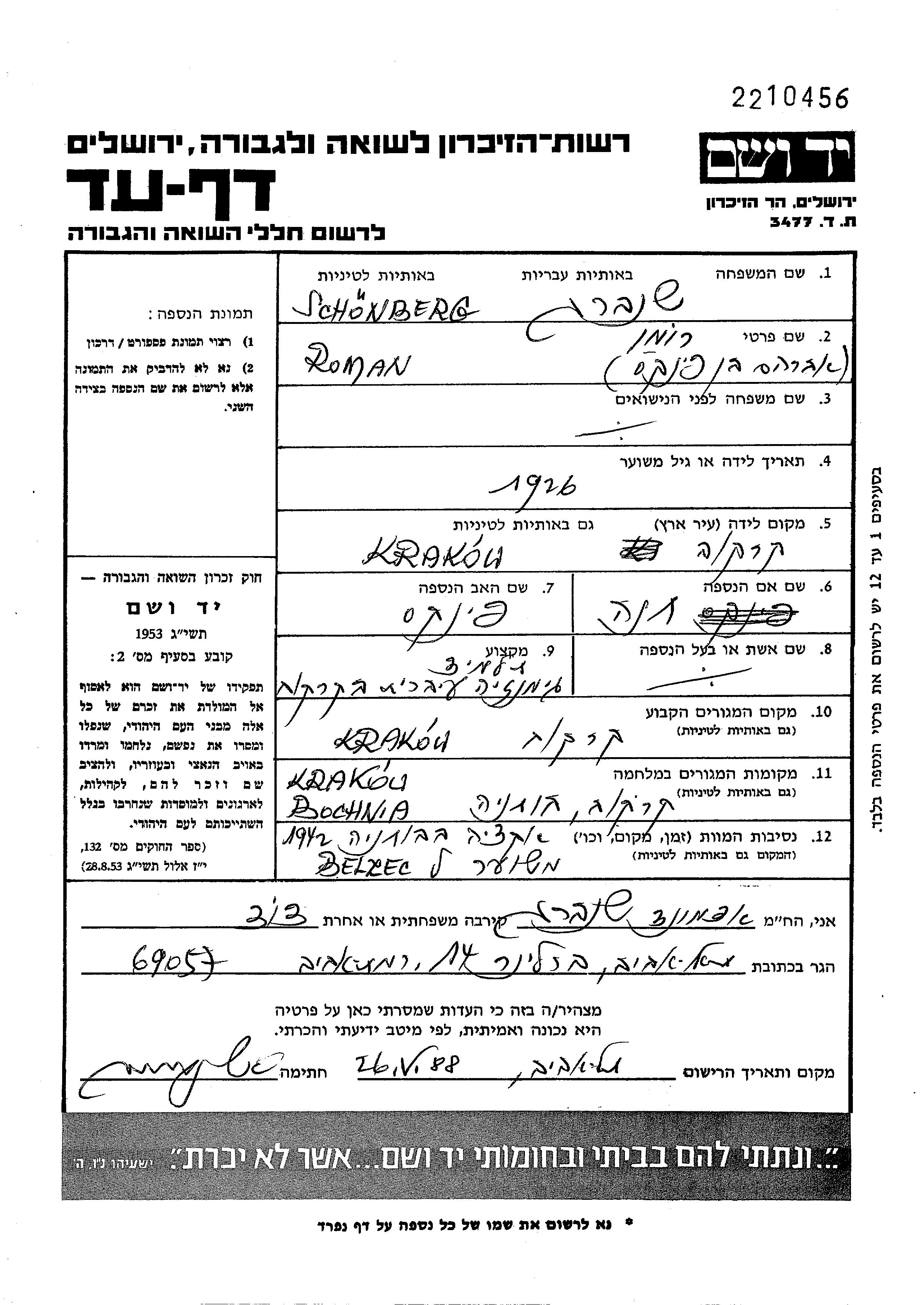 Роман Шонберг, место рождения: Краков, Польша. Отец: Пинкас, mать:Хана. Ученик / ученица. Место жительства до войны: Краков, Польша. Место во время войны: Бохня, Польша.