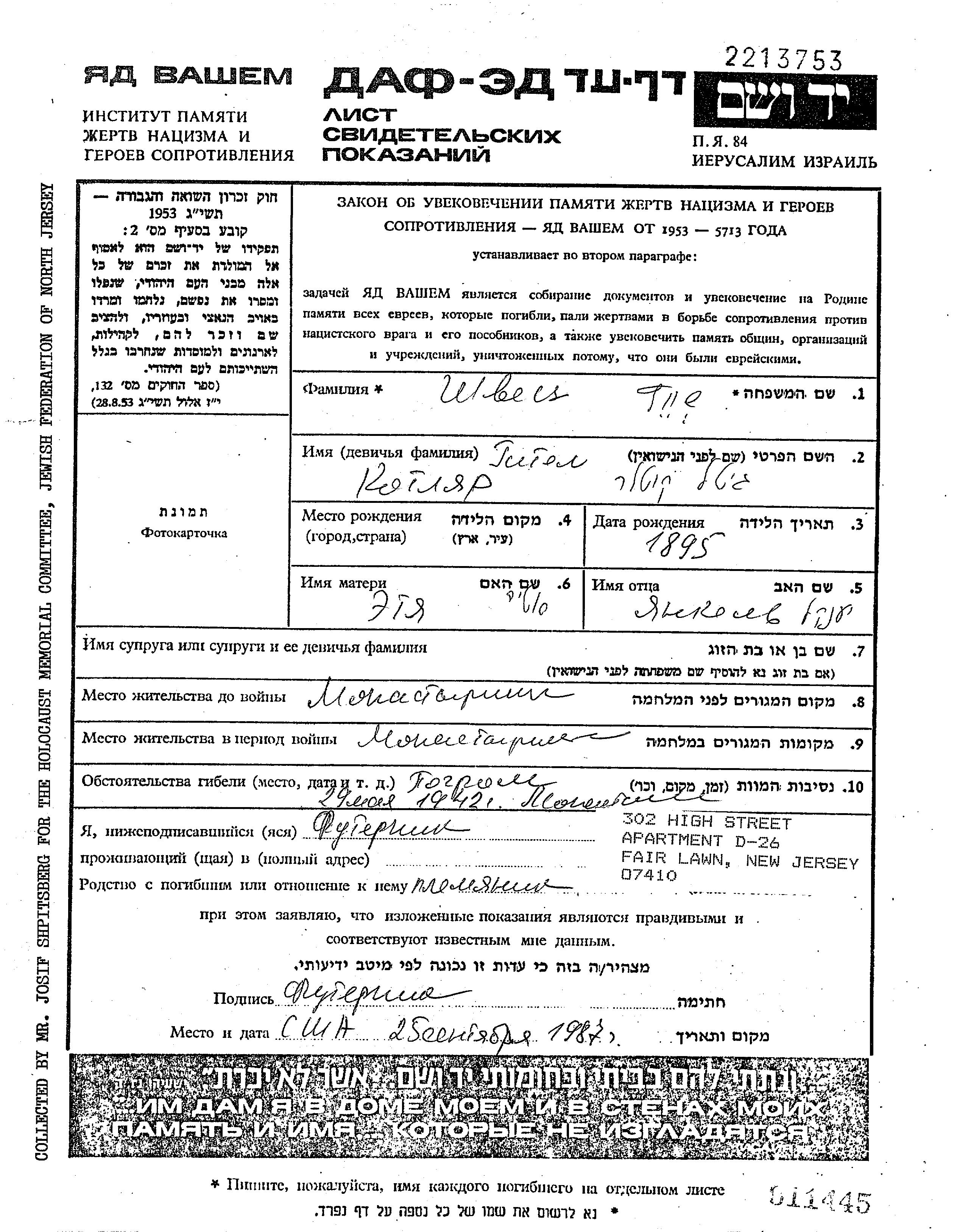 Швец Гитель Монастырище, Украина (СССР) Лист свидетельских показаний