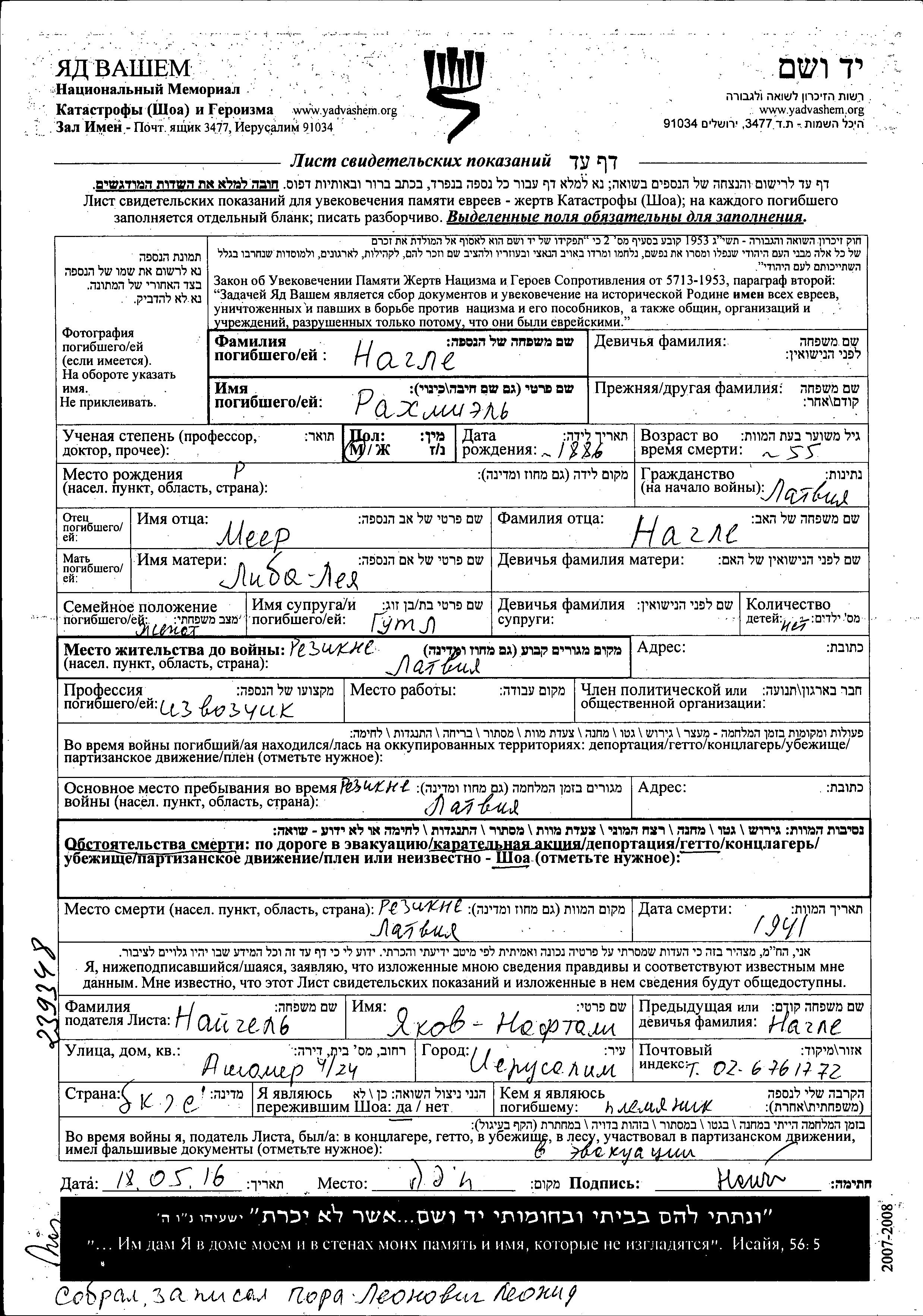 Яд Вашем - Листы свидетельских показаний Мемориального фонда