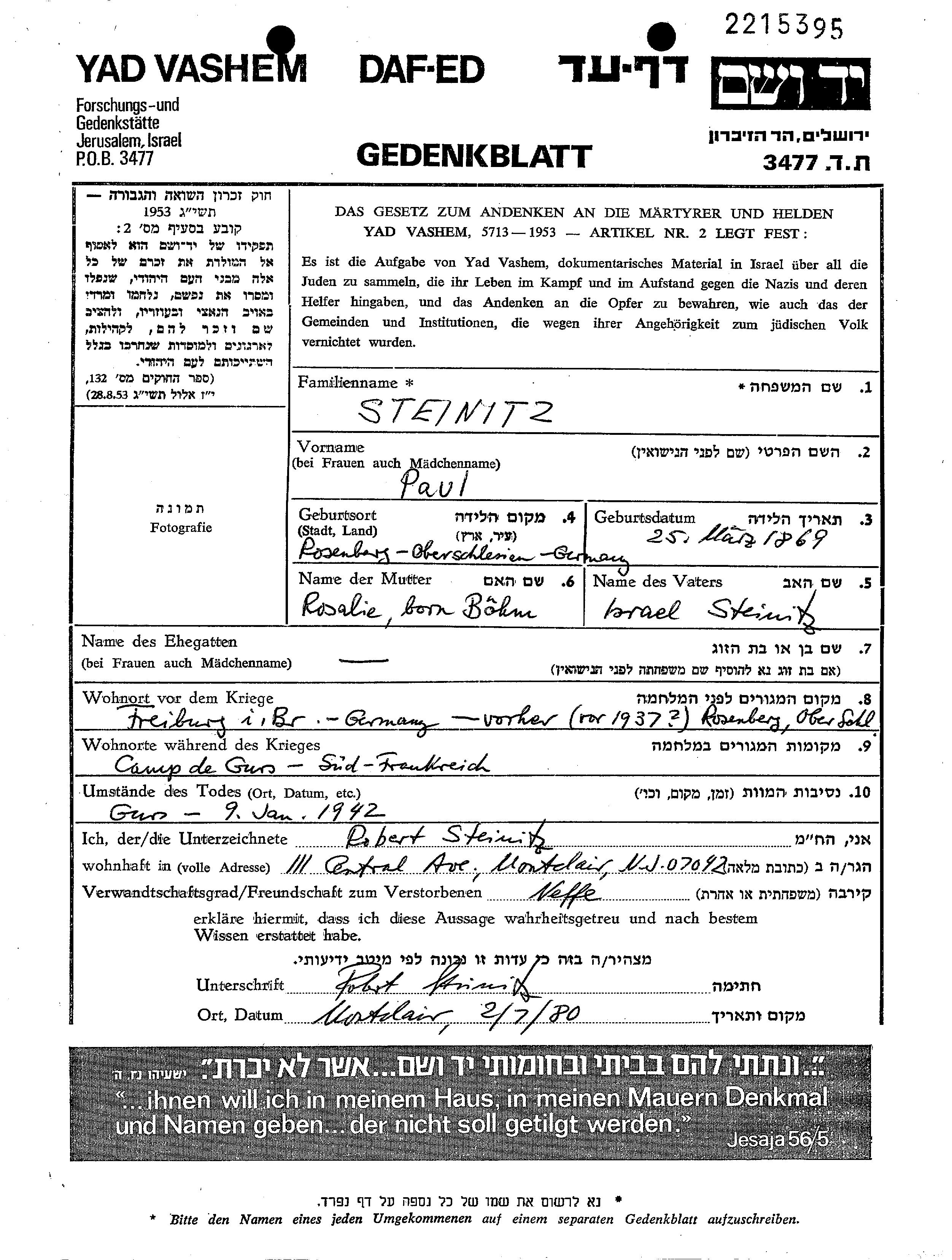 Пауль Штайниц, место рождения: Розенберг, Германия. Отец: Исраэль, mать:Розали, девичья фамилия Бём. Место жительства до войны: Фрейбург, Германия. Место во время войны: Гюрс, Франция.