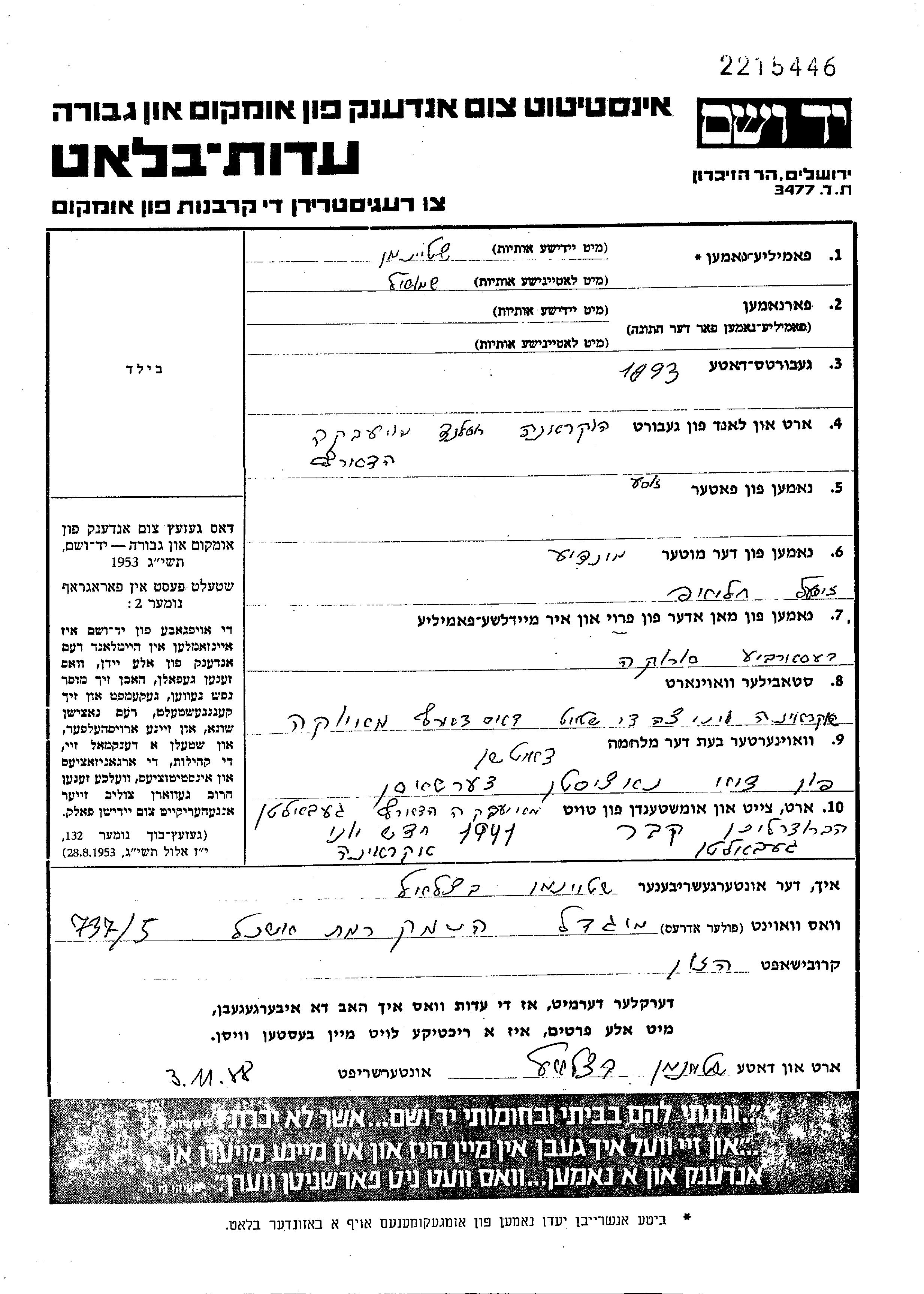Штайнман Шмуэль 1893 Сорока, Румыния Лист свидетельских показаний