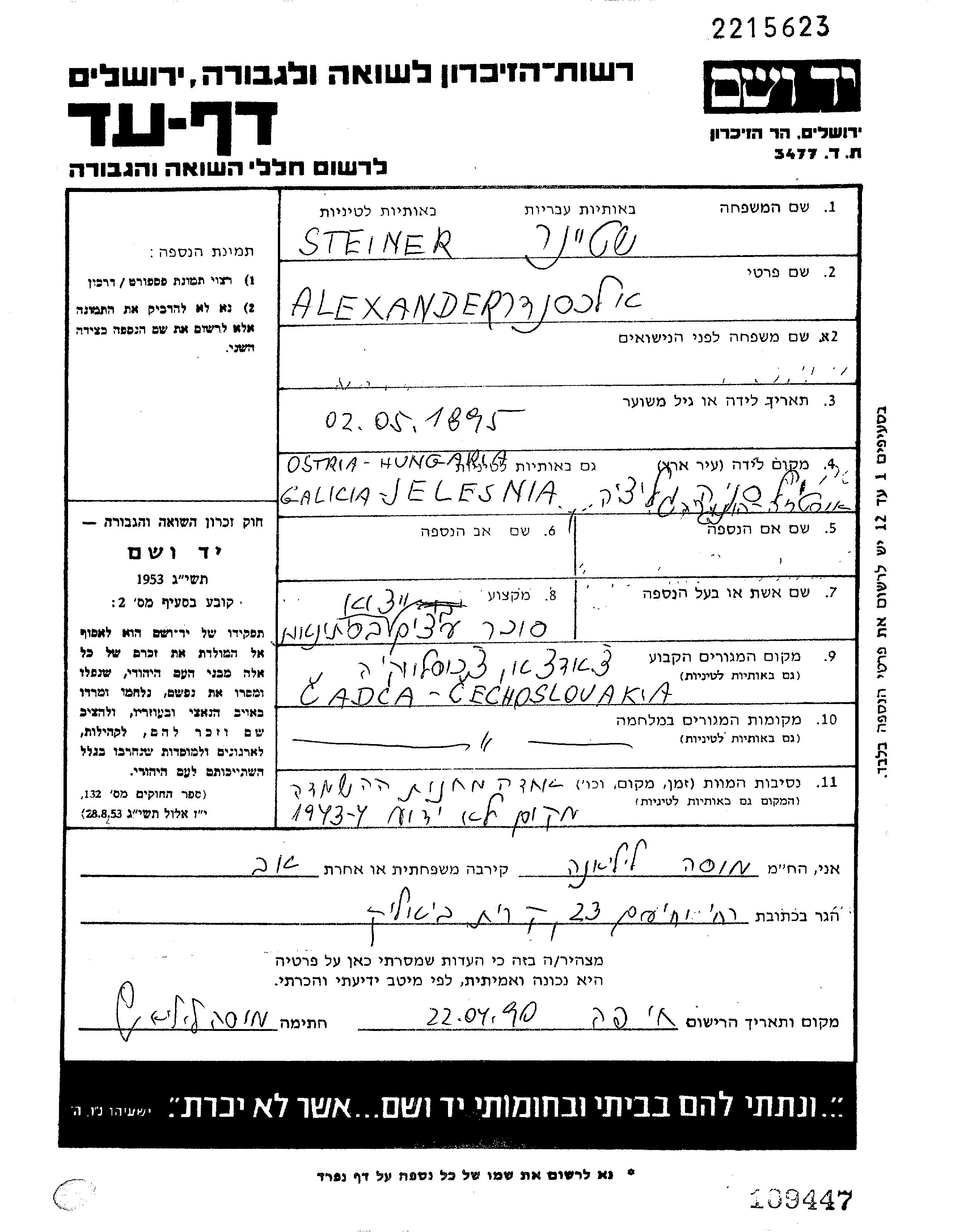 Штайнер Александер 1895 Чадца, Чехословакия Лист свидетельских показаний
