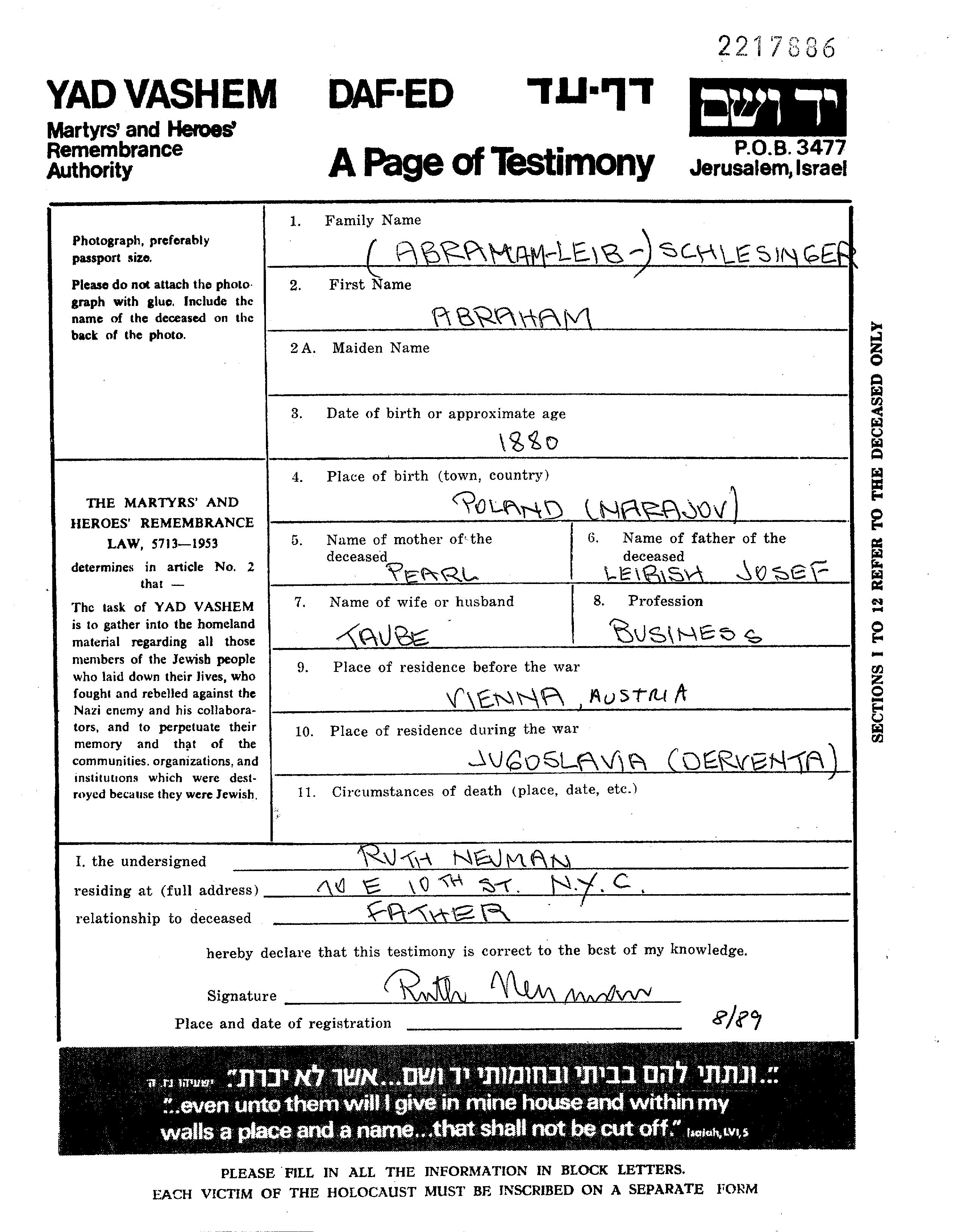 Абраам Лейб Шлезингер, место рождения: Нараев, Польша. Отец: Лейбиш Йосеф, mать:Перл. Предприниматель. Женат / замужем. Место жительства до войны: Вена, Австрия. Место во время войны: Дервента, Югославия.