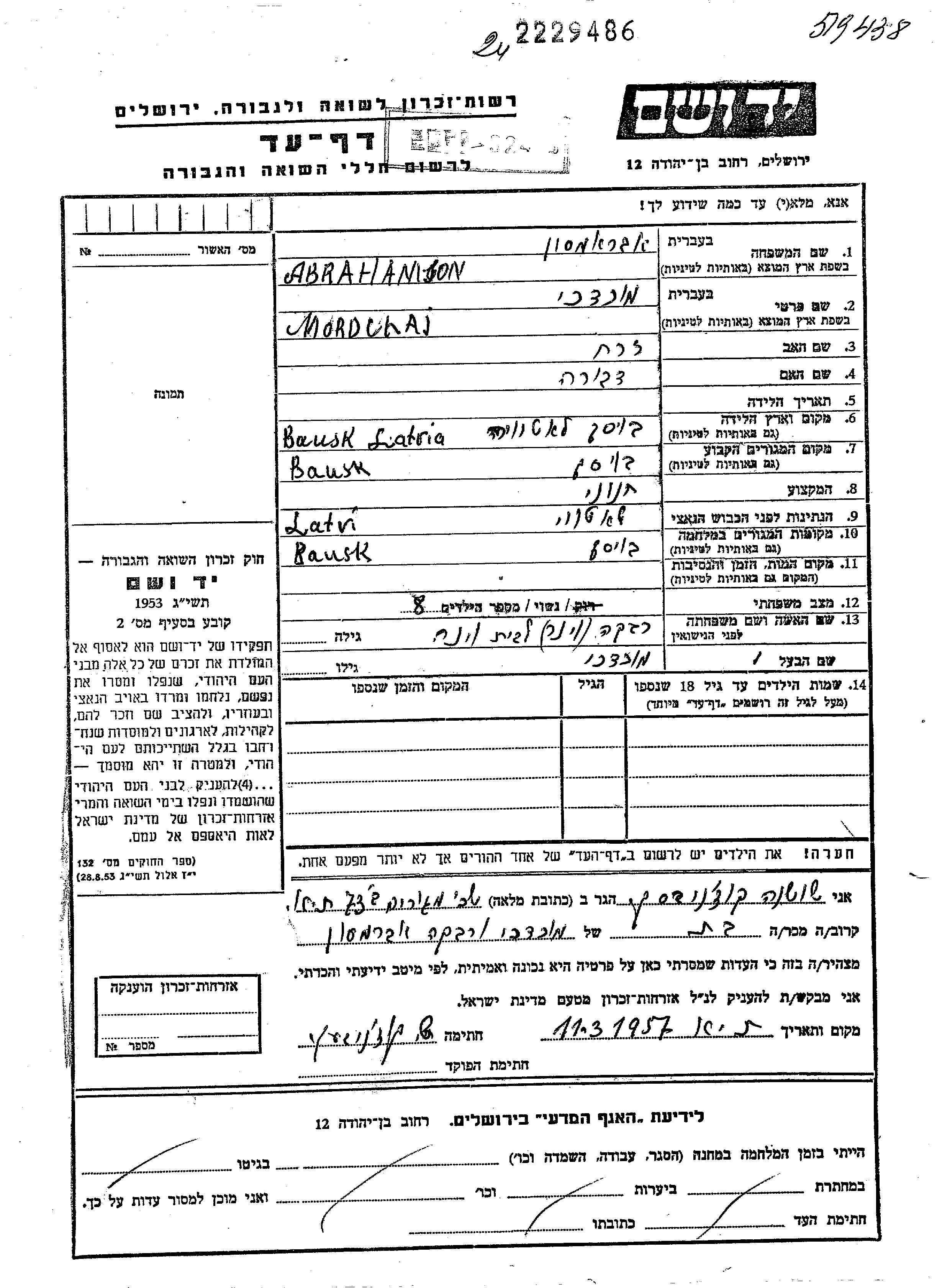 Мордехай Абрамсон, место рождения: Бауск, Латвия. Отец: Зерах, mать:Двора. Женат / замужем. Место жительства до войны: Бауск, Латвия. Место во время войны: Бауск, Латвия.