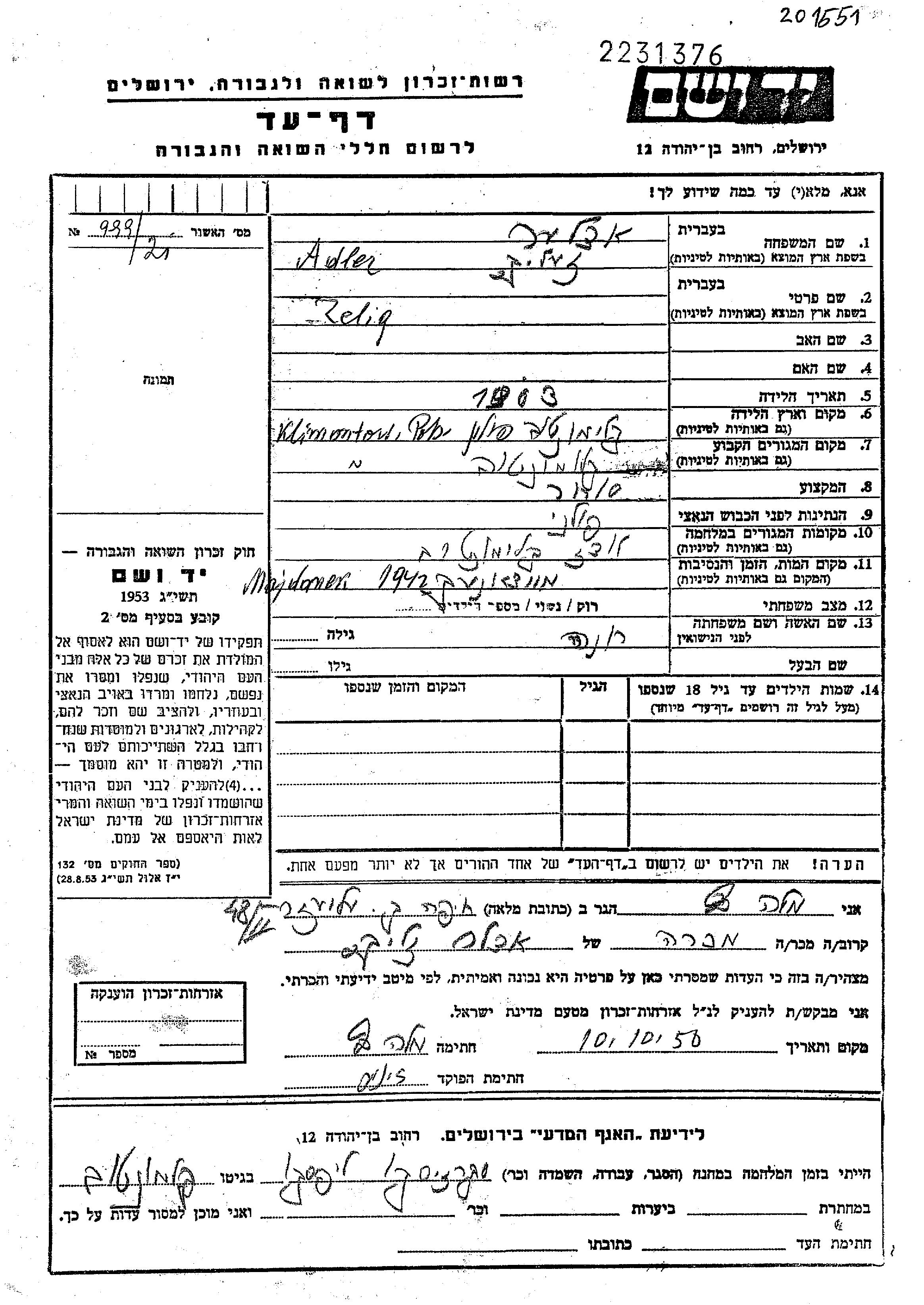 Адлер Зелиг 1903 Климонтув, Польша Лист свидетельских показаний