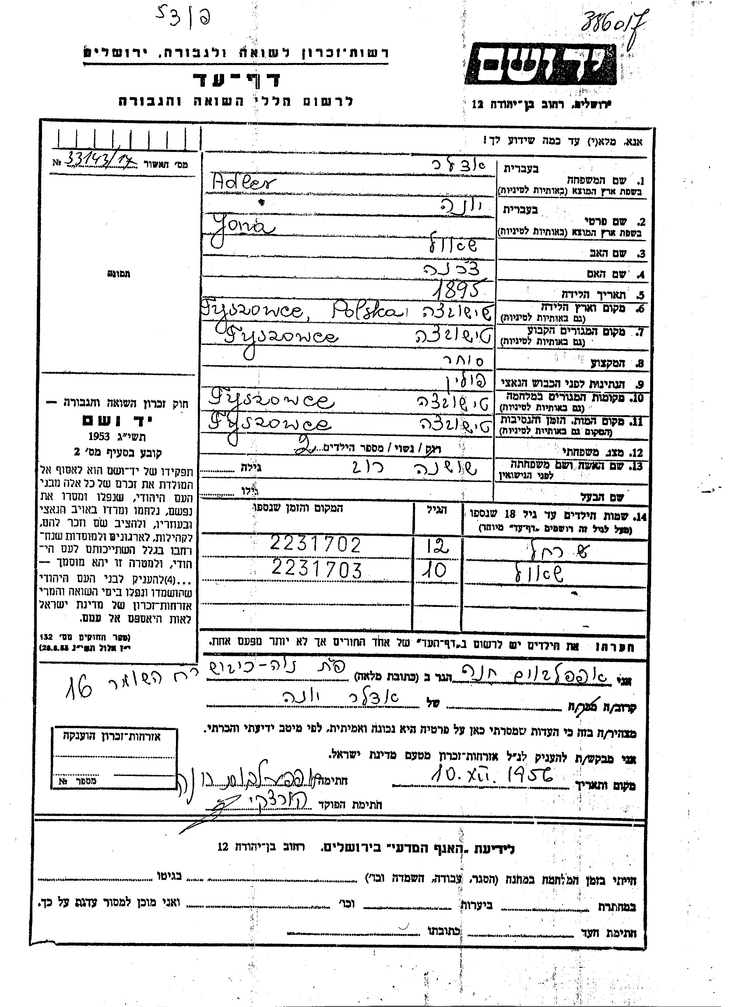 Рахель Адлер Иона Шошана девичья фамилия Руб. Ребенок. Место жительства до войны: Тышовце, Польша.