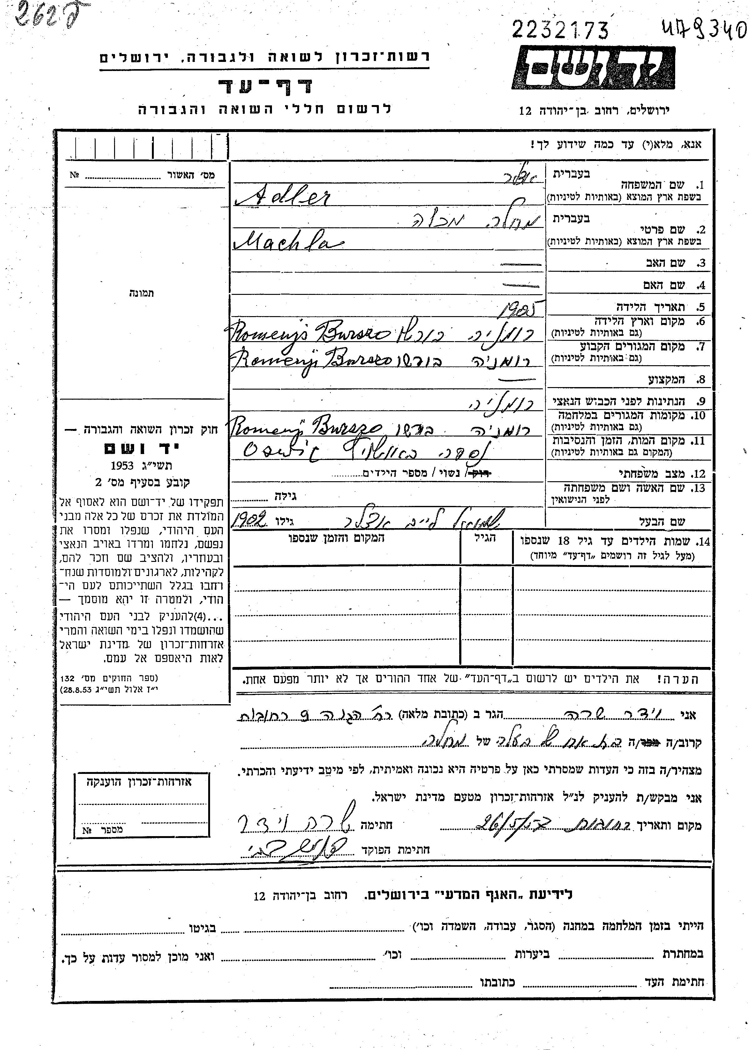 Махла Адлер, место рождения: Борша, Румыния. Женат / замужем. Место жительства до войны: Борша, Румыния. Место во время войны: Борша, Румыния.