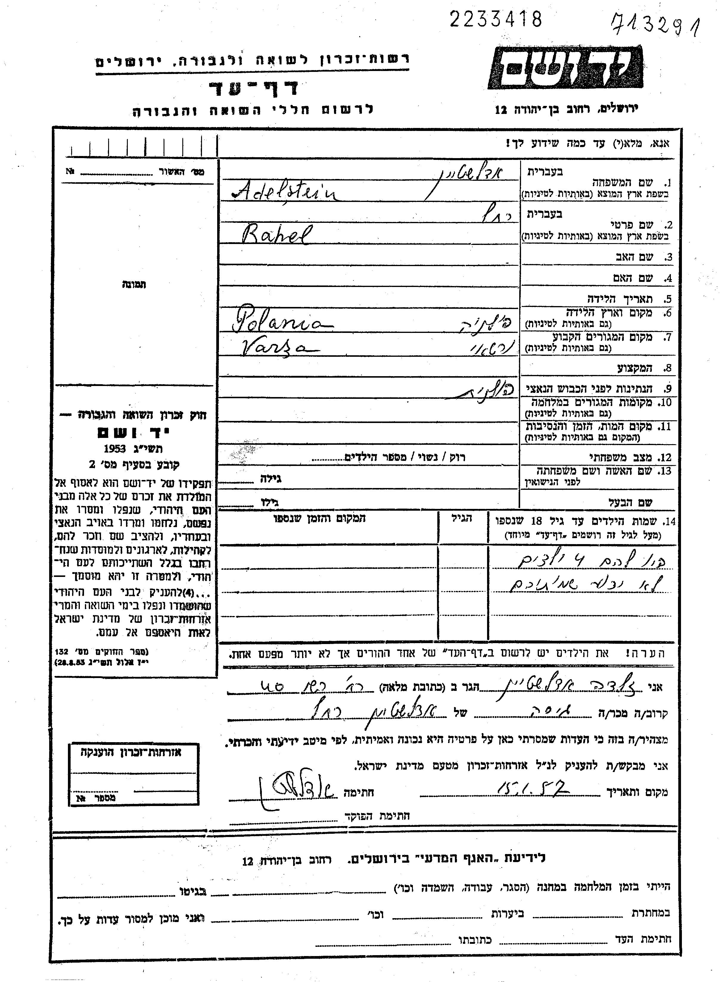 Адельштайн Рахель Варшава, Польша Лист свидетельских показаний