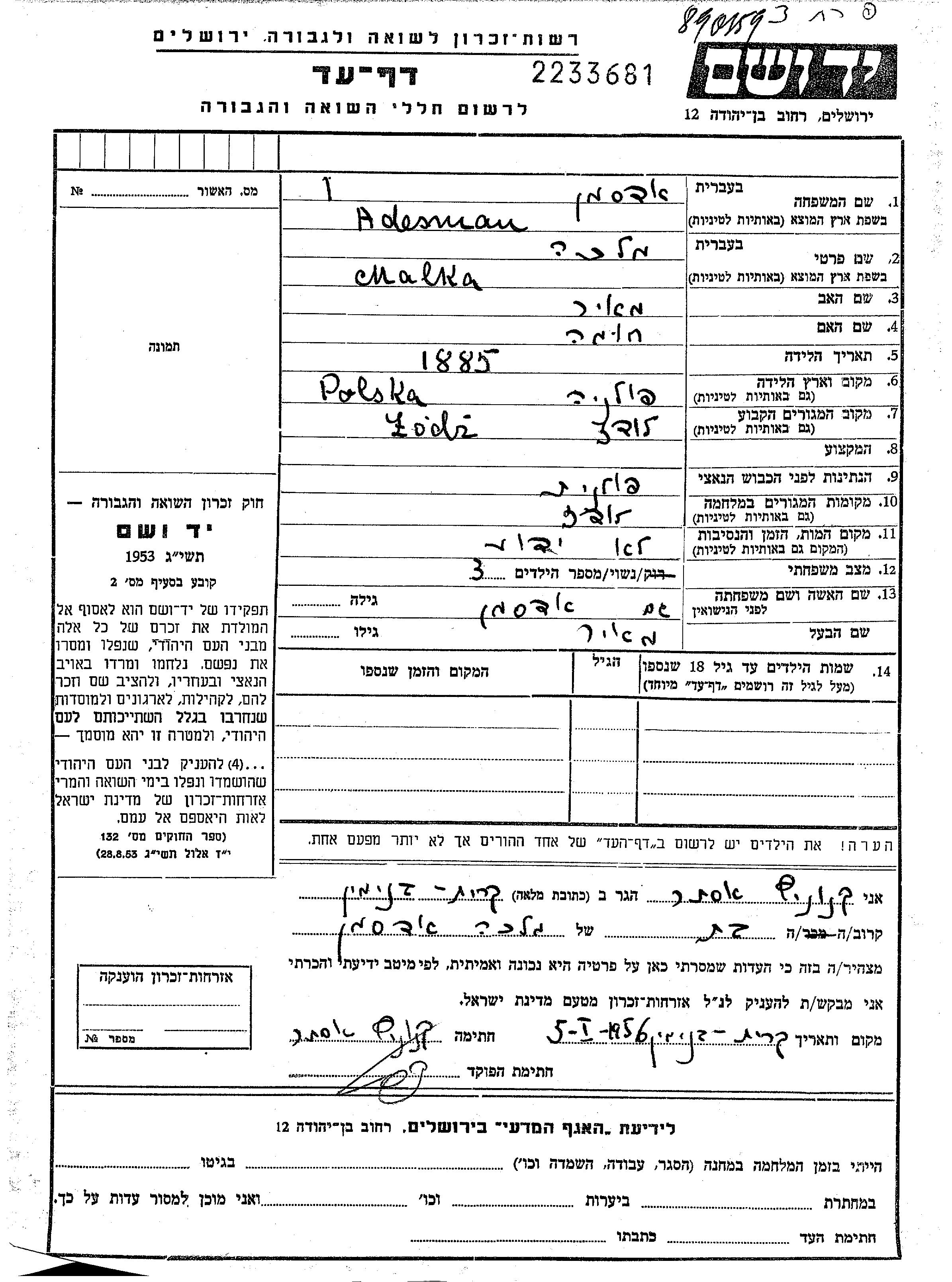 Малка Адесман, место рождения: Польша. Отец: Меир, mать:Хума. Женат / замужем. Место жительства до войны: Лодзь, Польша. Место во время войны: Лодзь, Польша.