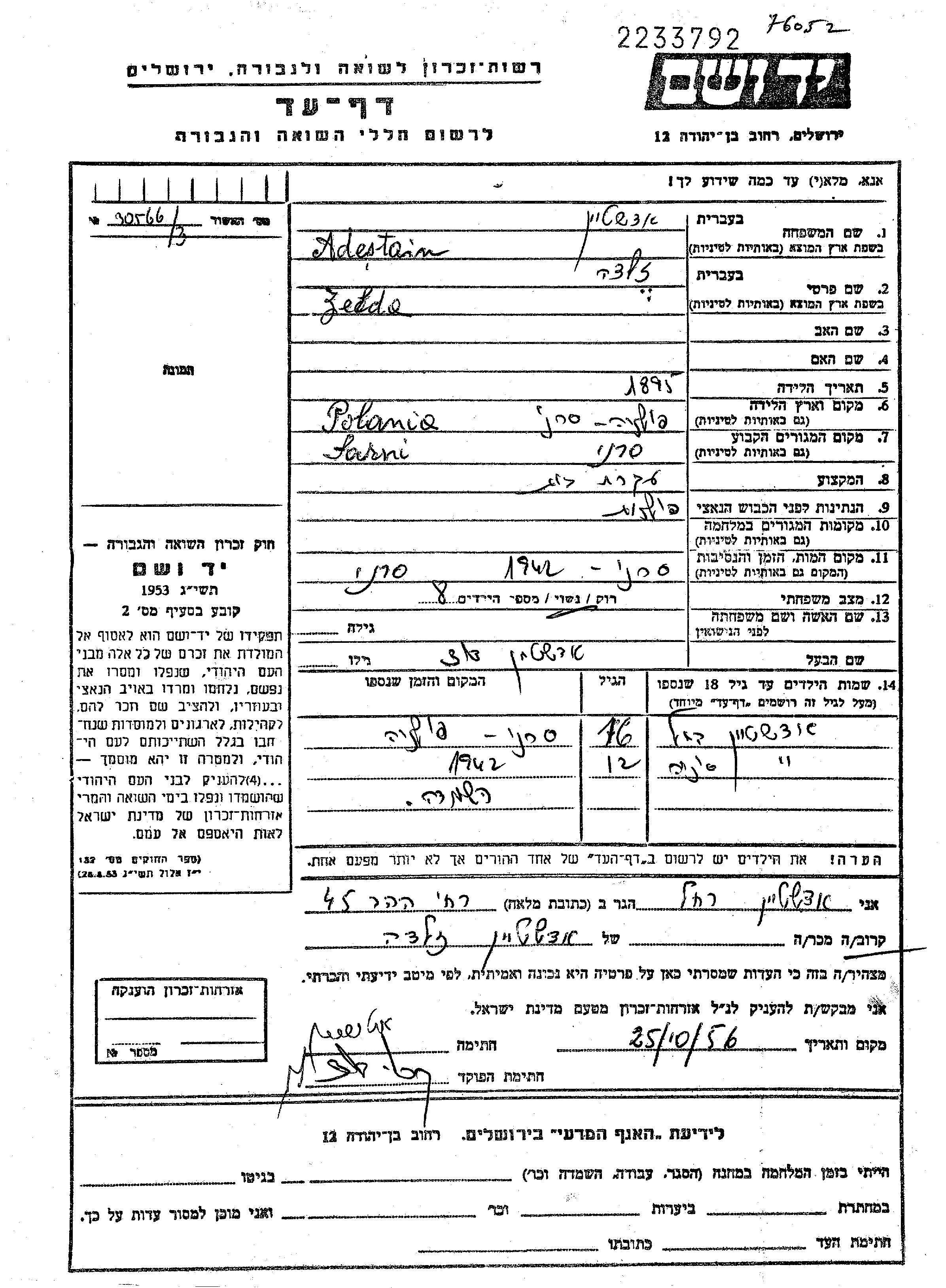 Зельда Адештайн, место рождения: Сарны, Польша. Домохозяйка. Женат / замужем. Место жительства до войны: Сарны, Польша.