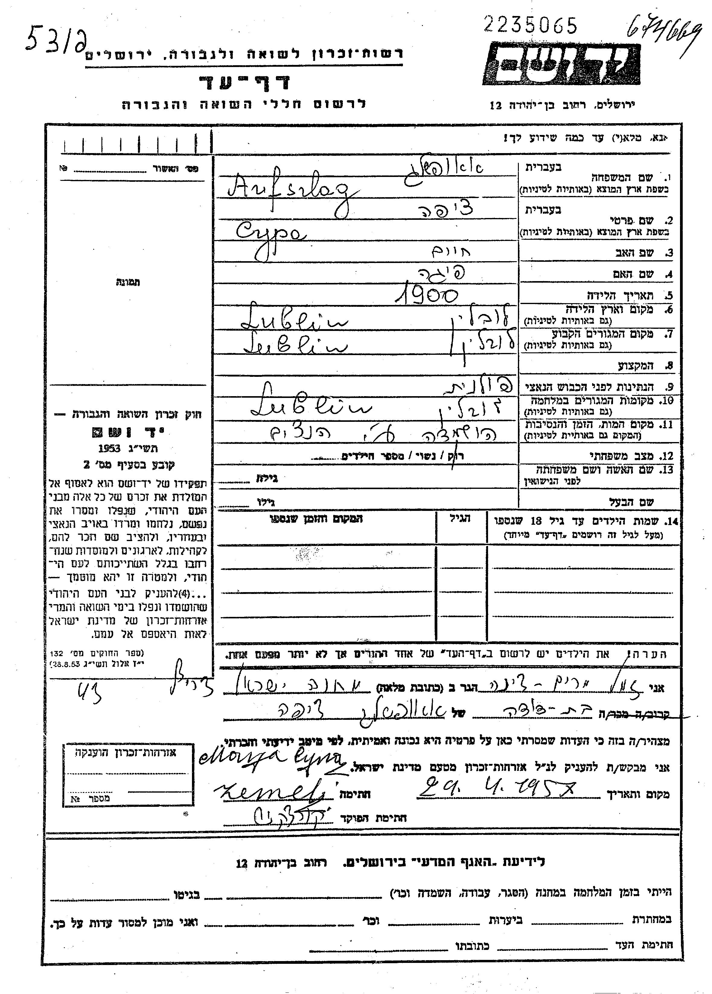 Ауфшлаг Ципа 1900 Люблин, Польша Лист свидетельских показаний