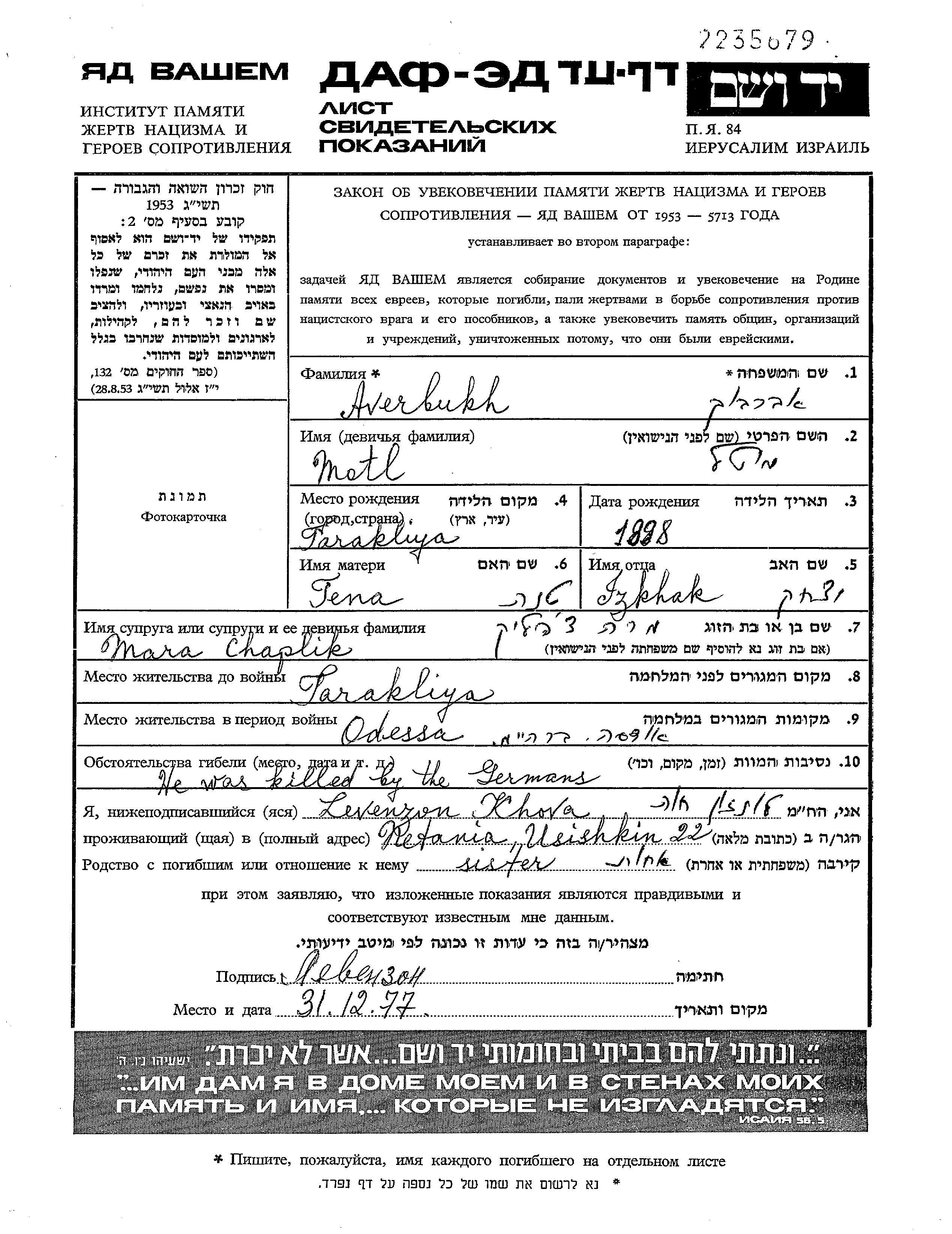 Мотл Авербух, место рождения: Тараклия, Румыния. Отец: Ицхак, mать:Тена Тана. Женат / замужем. Место жительства до войны: Тараклия, Румыния. Место во время войны: Одесса, Украина (СССР).