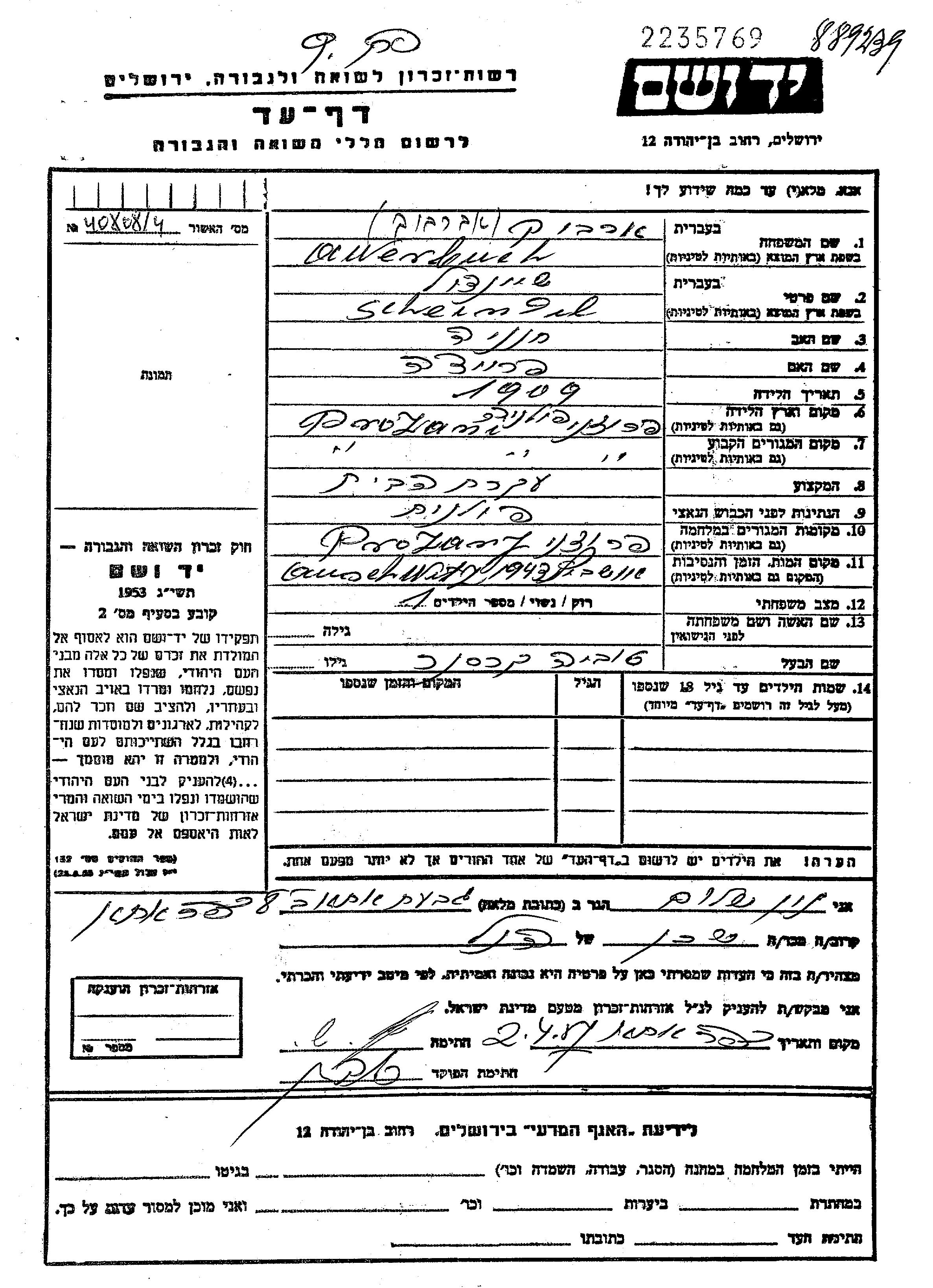 Авербух Шейндул 1909 Пружаны, Польша Лист свидетельских показаний
