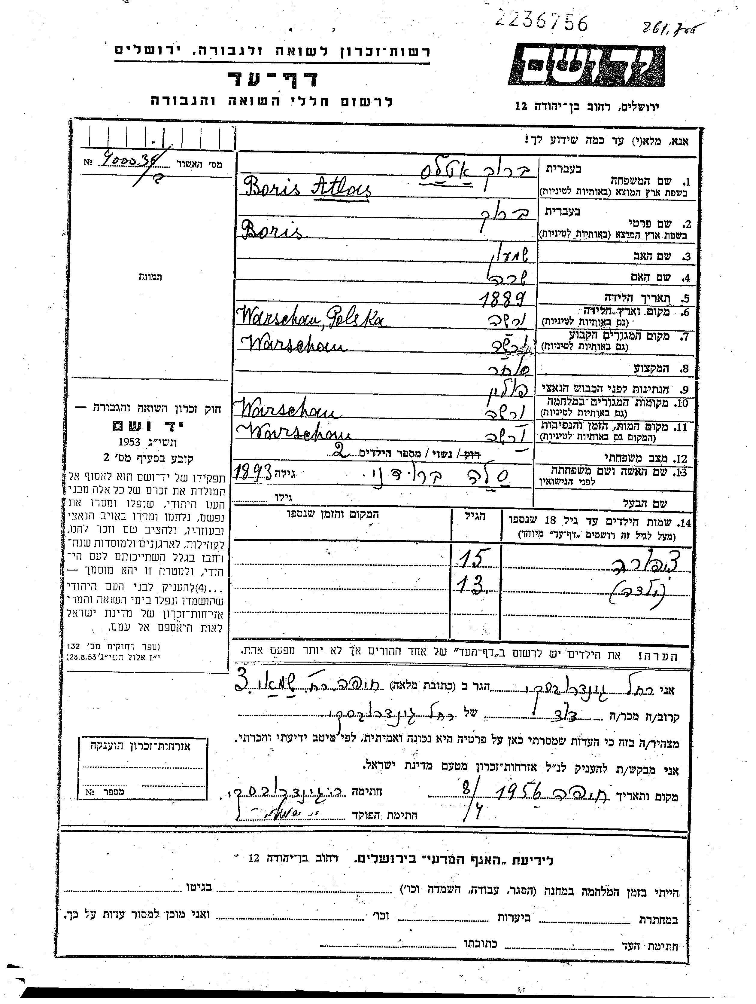 Борис Барух Атлас, место рождения: Варшава, Польша. Отец: Шимон, mать:Сара. Торговец / торговка. Женат / замужем. Место жительства до войны: Варшава, Польша. Место во время войны: Варшава, Польша.