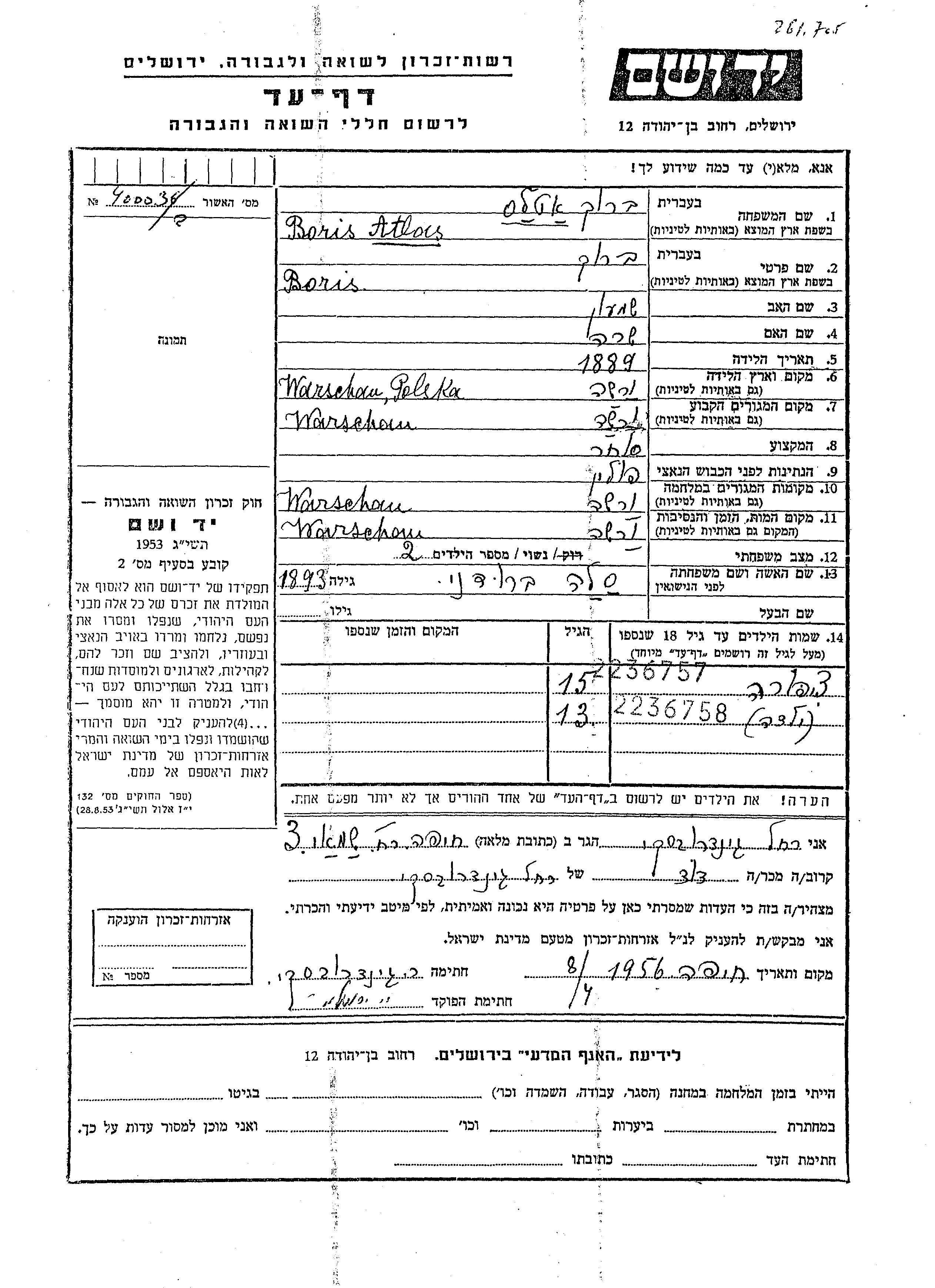 Атлас Ципора Варшава, Польша Лист свидетельских показаний