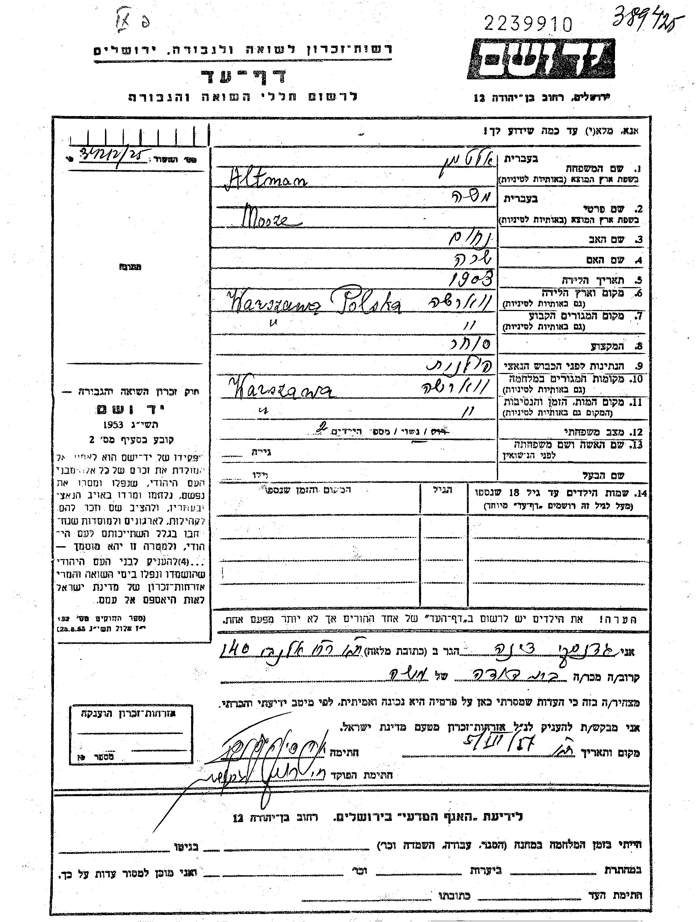 Моше Альтман, место рождения: Варшава, Польша. Отец: Нахум, mать:Сара. Торговец / торговка. Женат / замужем. Место жительства до войны: Варшава, Польша. Место во время войны: Варшава, Польша.