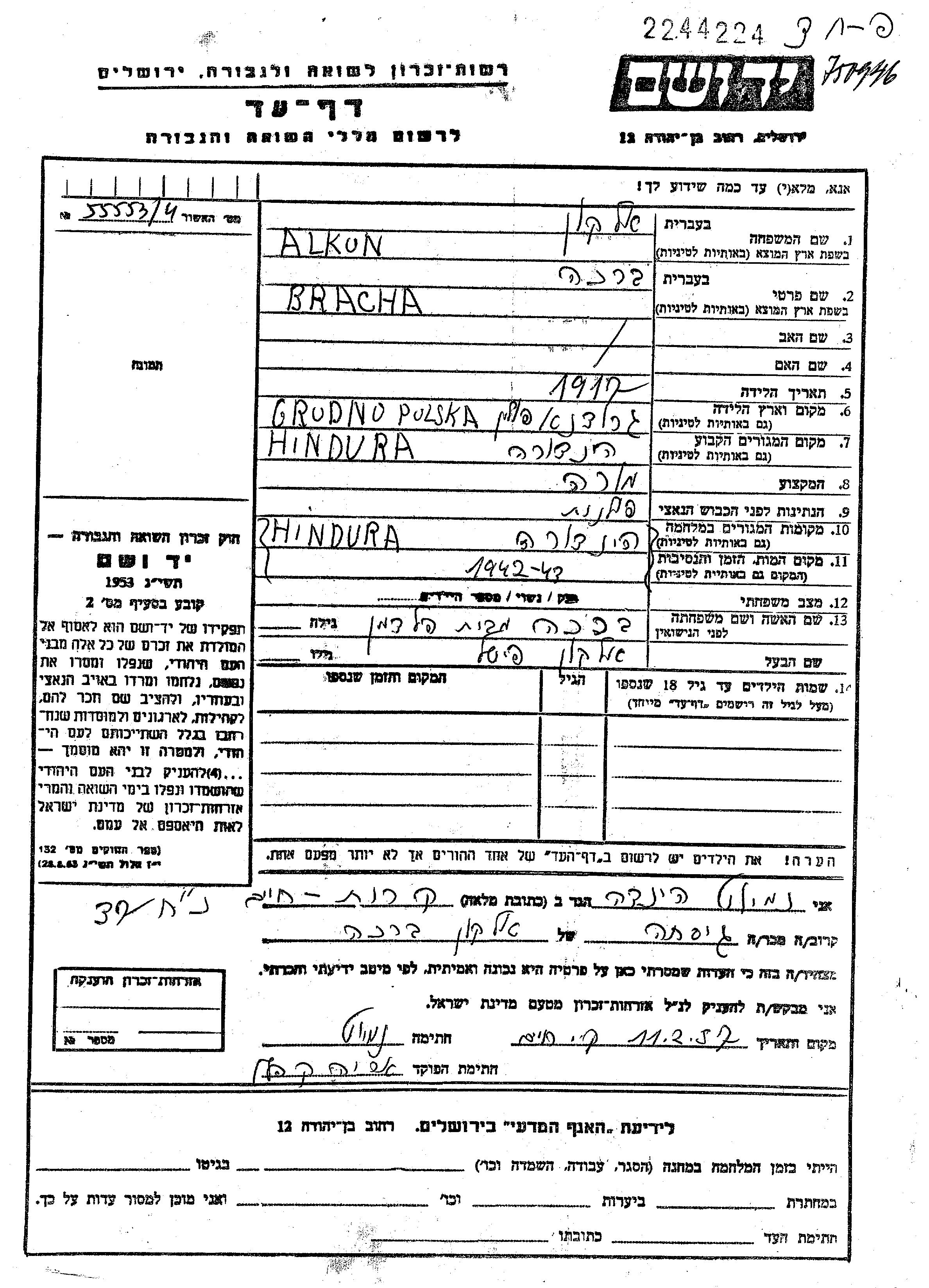 Браха Алькон, девичья фамилия Фельдман, место рождения: Гродно, Польша. Учитель / учительница. Женат / замужем. Место жительства до войны: Индура, Польша. Место во время войны: Индура, Польша.