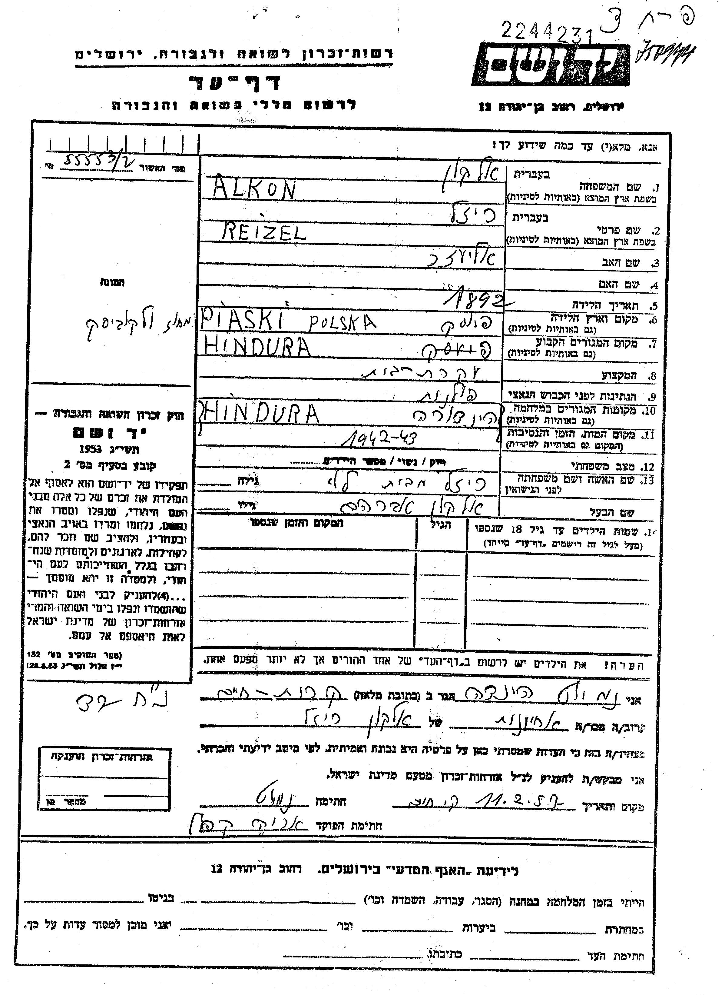 Рейзл Алькон, девичья фамилия Леви, место рождения: Пяски, Польша. Отец: Элиэзер. Домохозяйка. Женат / замужем. Место жительства до войны: Индура, Польша. Место во время войны: Индура, Польша.