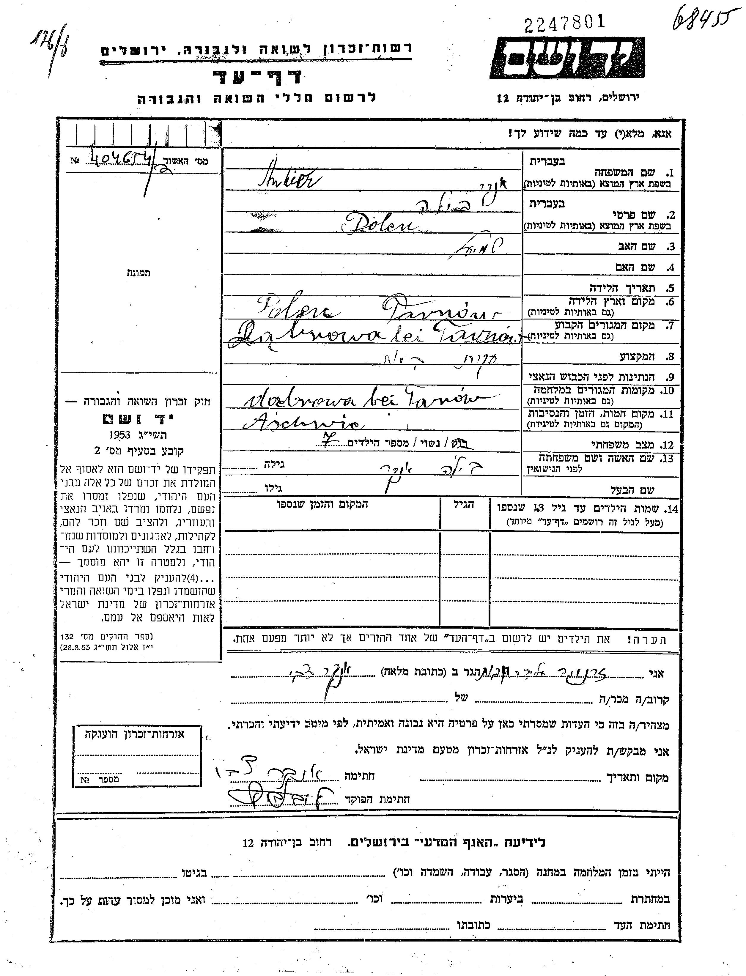 Яд Вашем - Листы свидетельских показаний Мемориального фонда