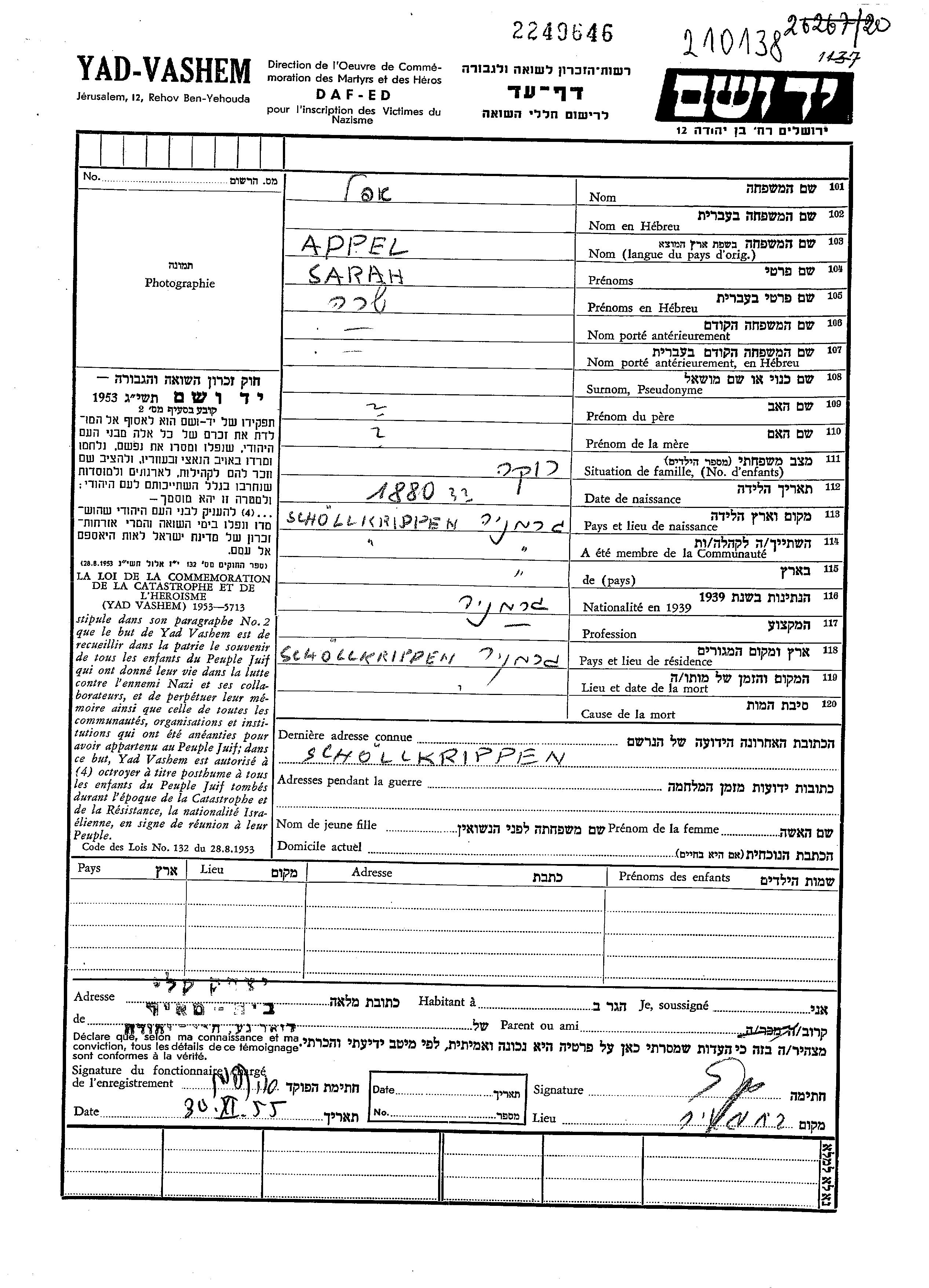 Сара Аппель, место рождения: Шёллькриппен, Германия. Холост / не замужем. Место жительства до войны: Шёллькриппен, Германия. Место во время войны: Шёллькриппен, Германия.