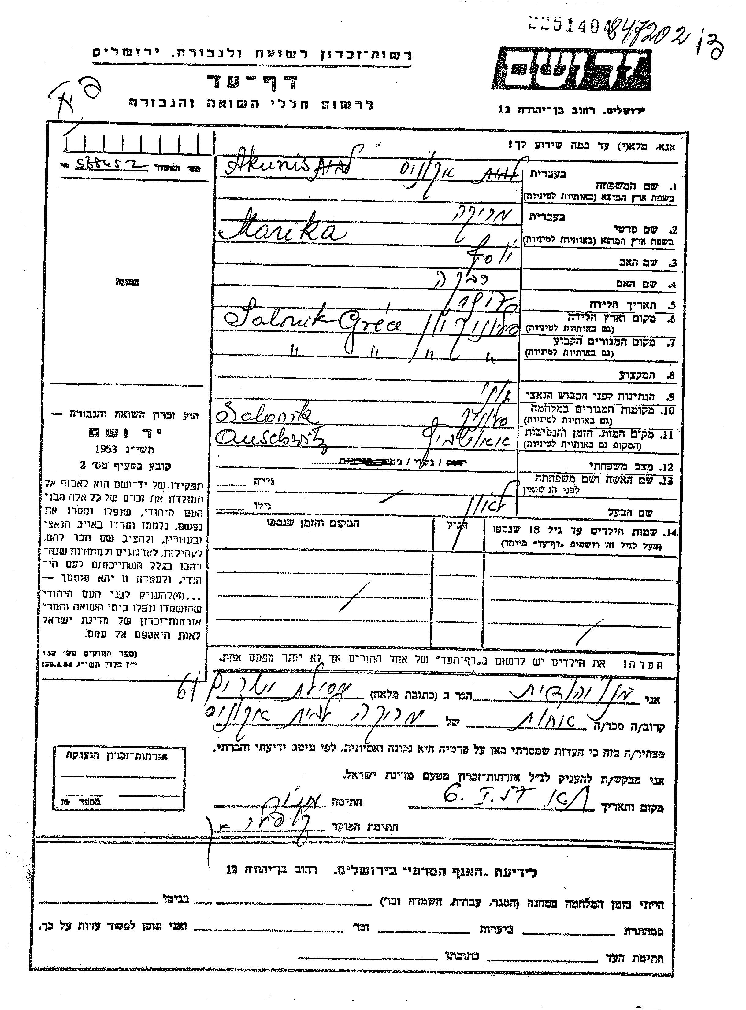 Марика Акунис, место рождения: Салоники, Греция. Отец: Йосеф, mать:Ривка. Женат / замужем. Место жительства до войны: Салоники, Греция. Место во время войны: Салоники, Греция.