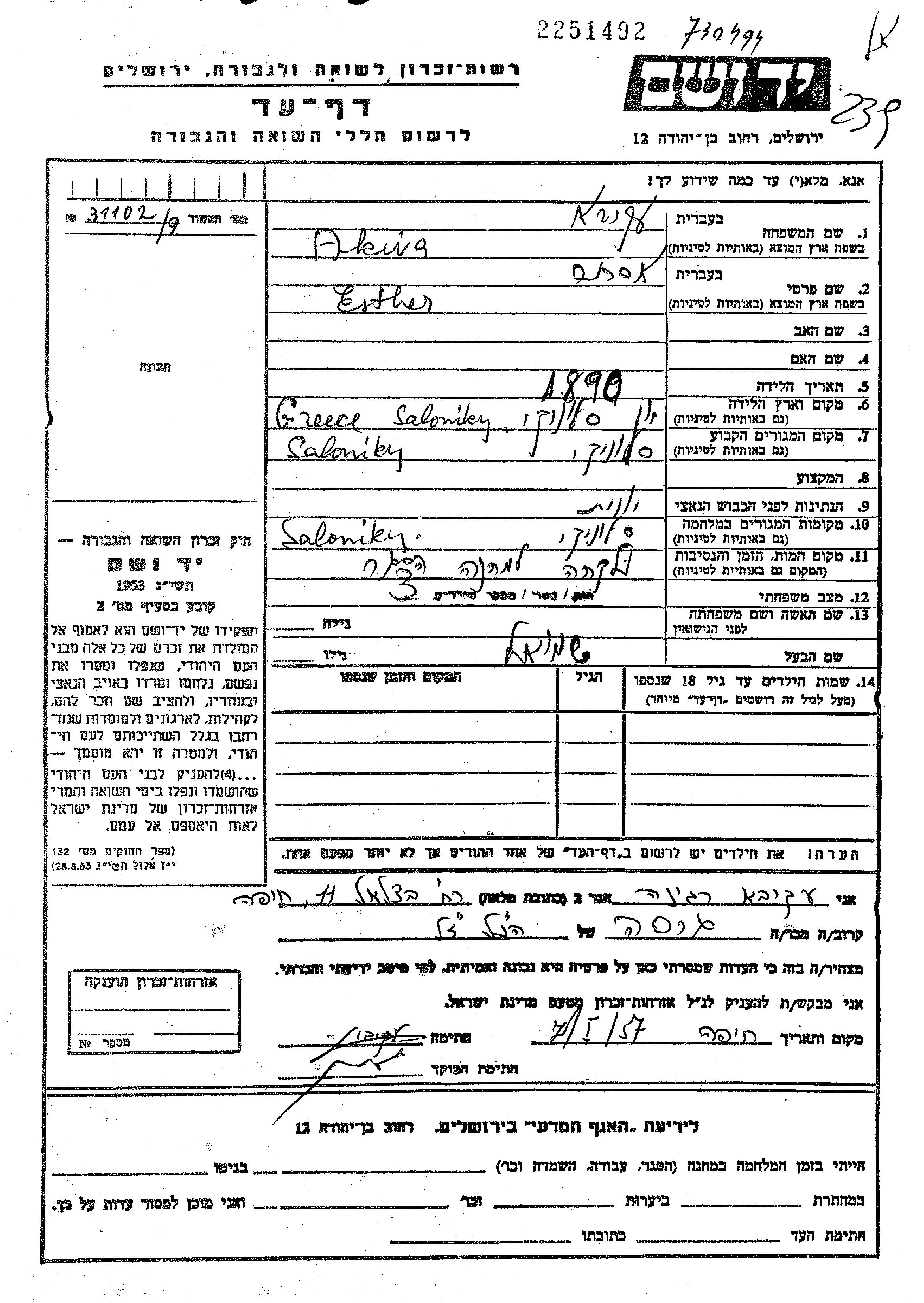 Акива Эстер 1890 Салоники, Греция Лист свидетельских показаний