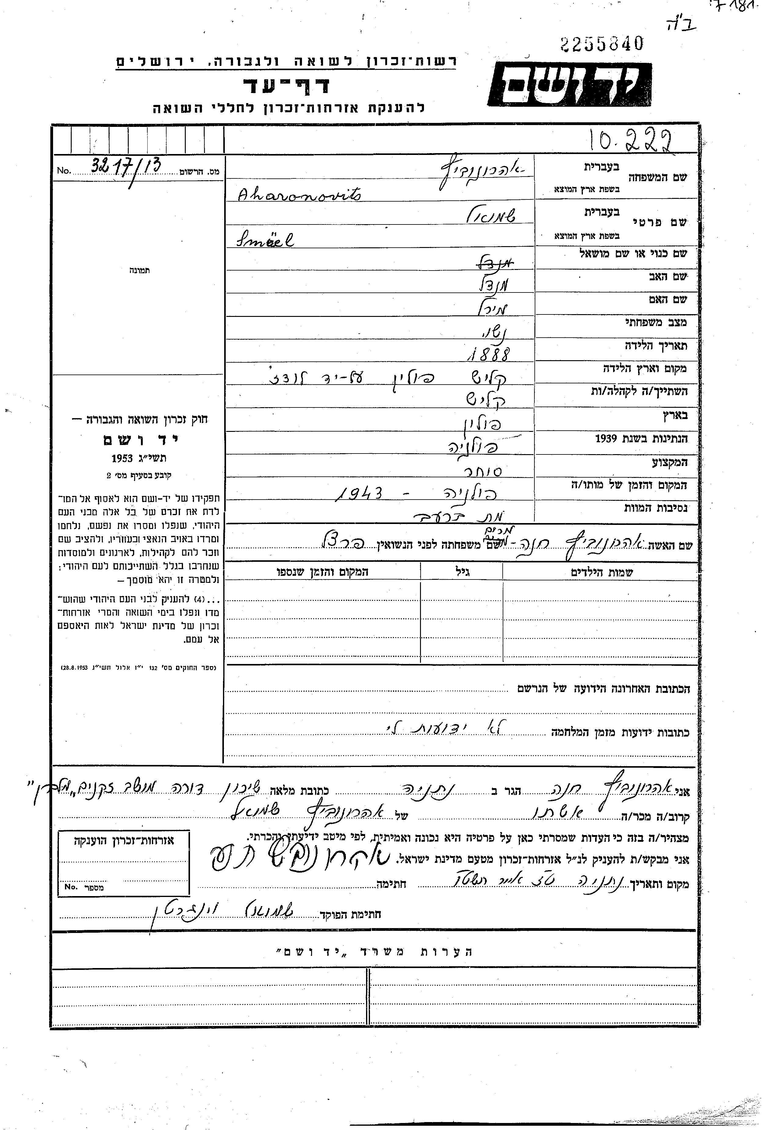 Ахароновиц Шмуэль 1888 Калиш, Польша Лист свидетельских показаний