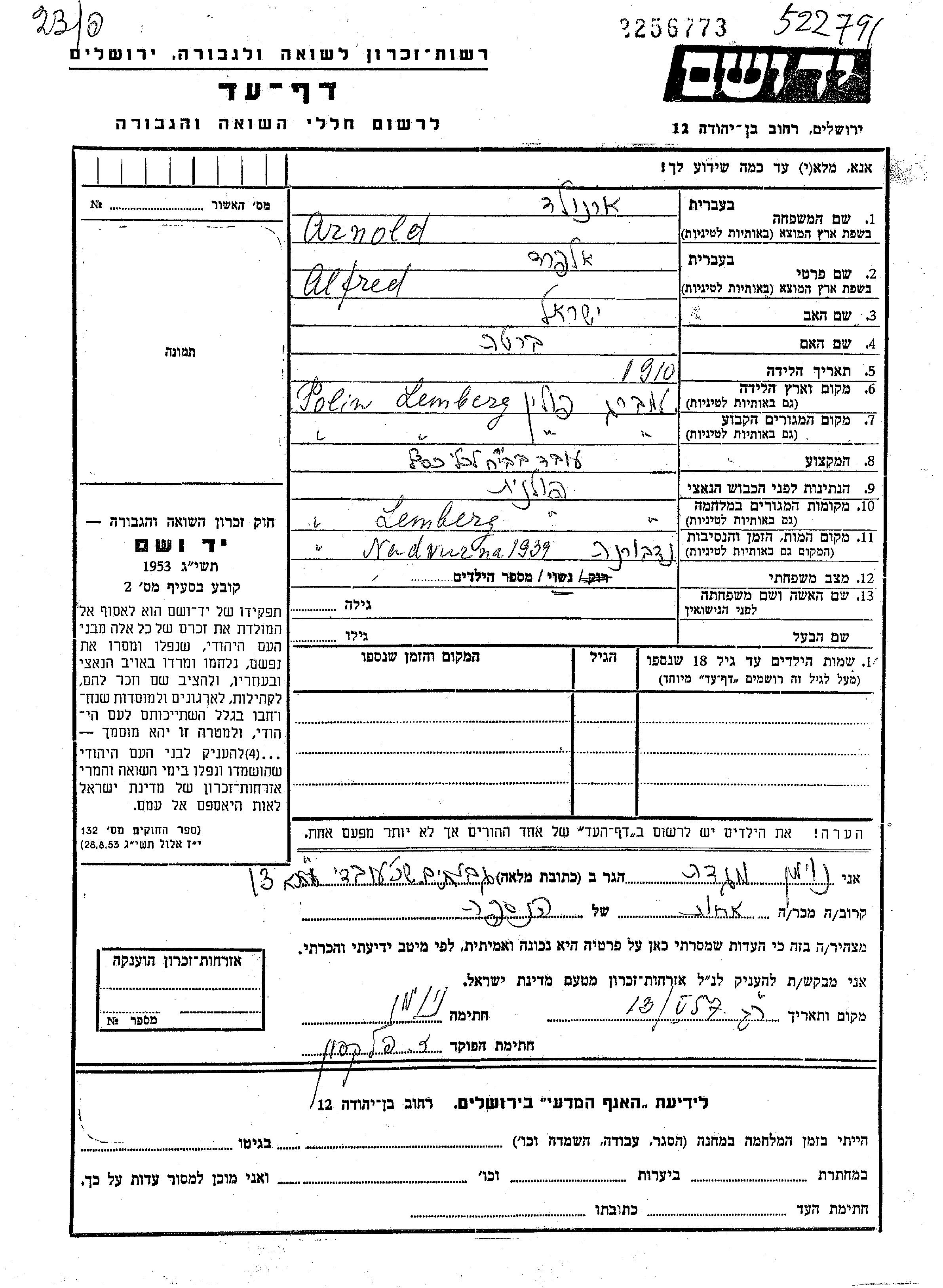 Альфред Арнольд, место рождения: Лемберг, Польша. Отец: Исраэль, mать:Берта, девичья фамилия Шварц. Рабочий / рабочая. Женат / замужем. Место жительства до войны: Лемберг, Польша. Место во время войны: Лемберг, Польша.