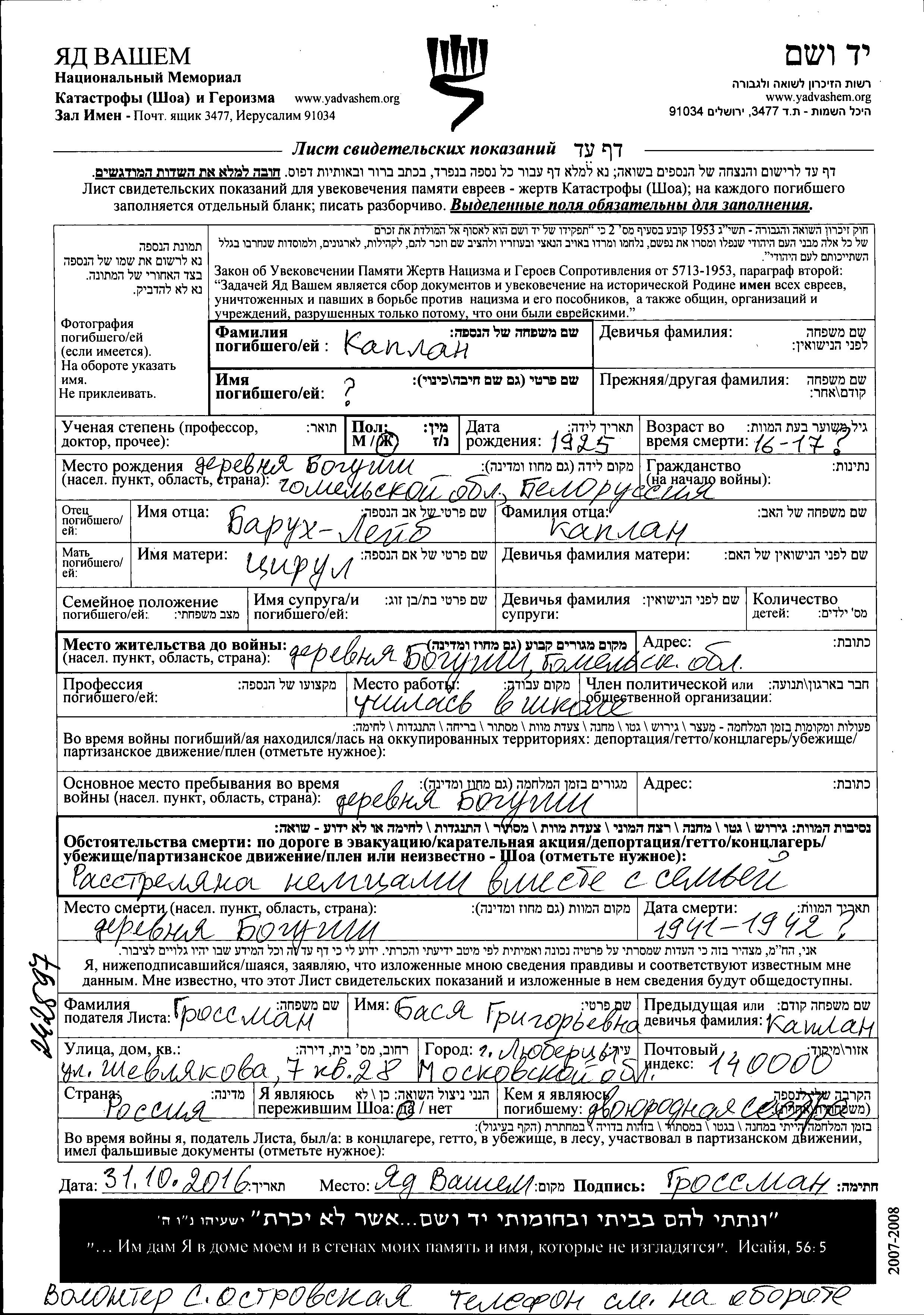 Каплан Имя неизвестно 1925 Богуши, Белоруссия (СССР) Лист свидетельских показаний