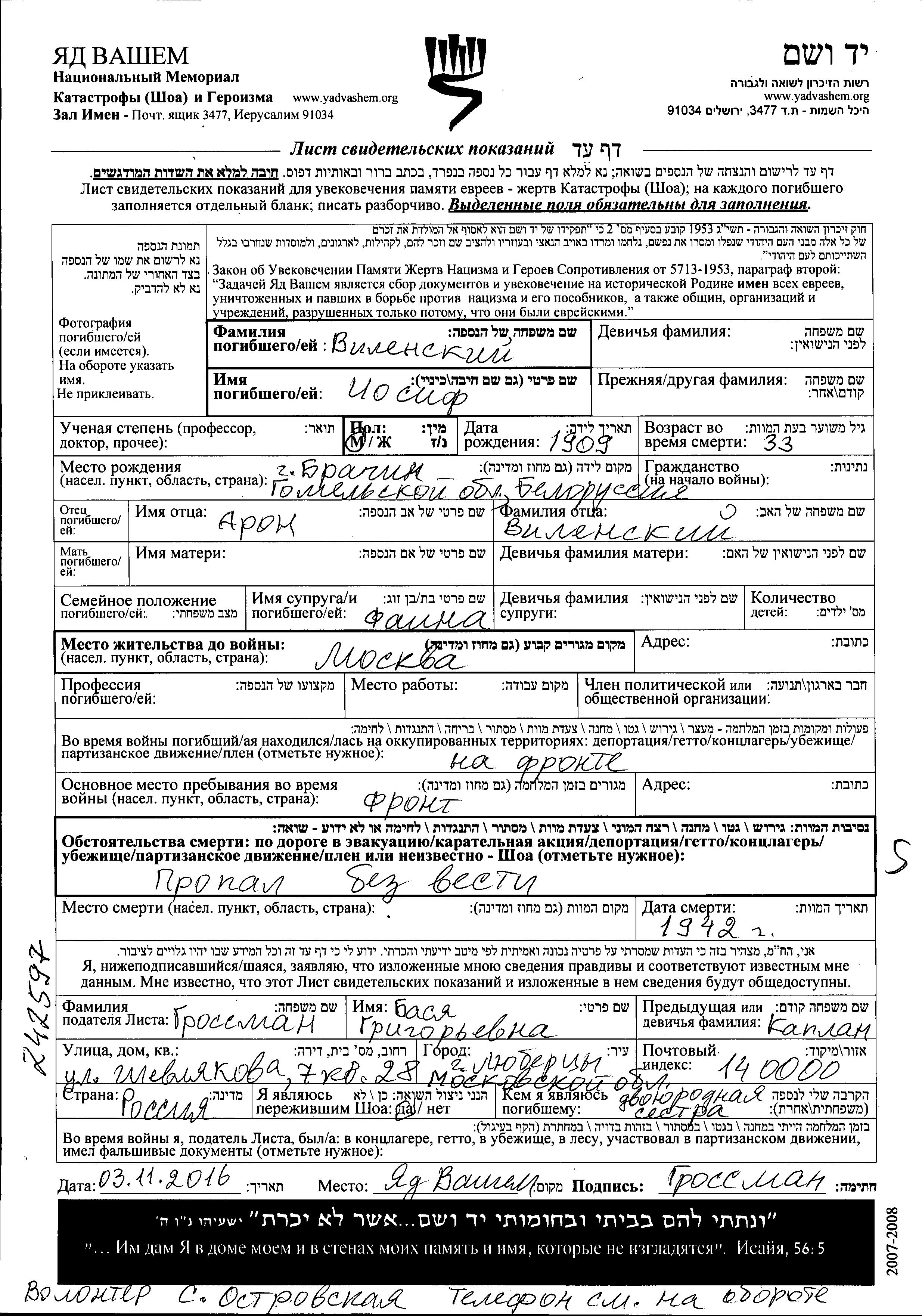 Виленский Иосиф 1909 Москва, Россия (СССР) Лист свидетельских показаний