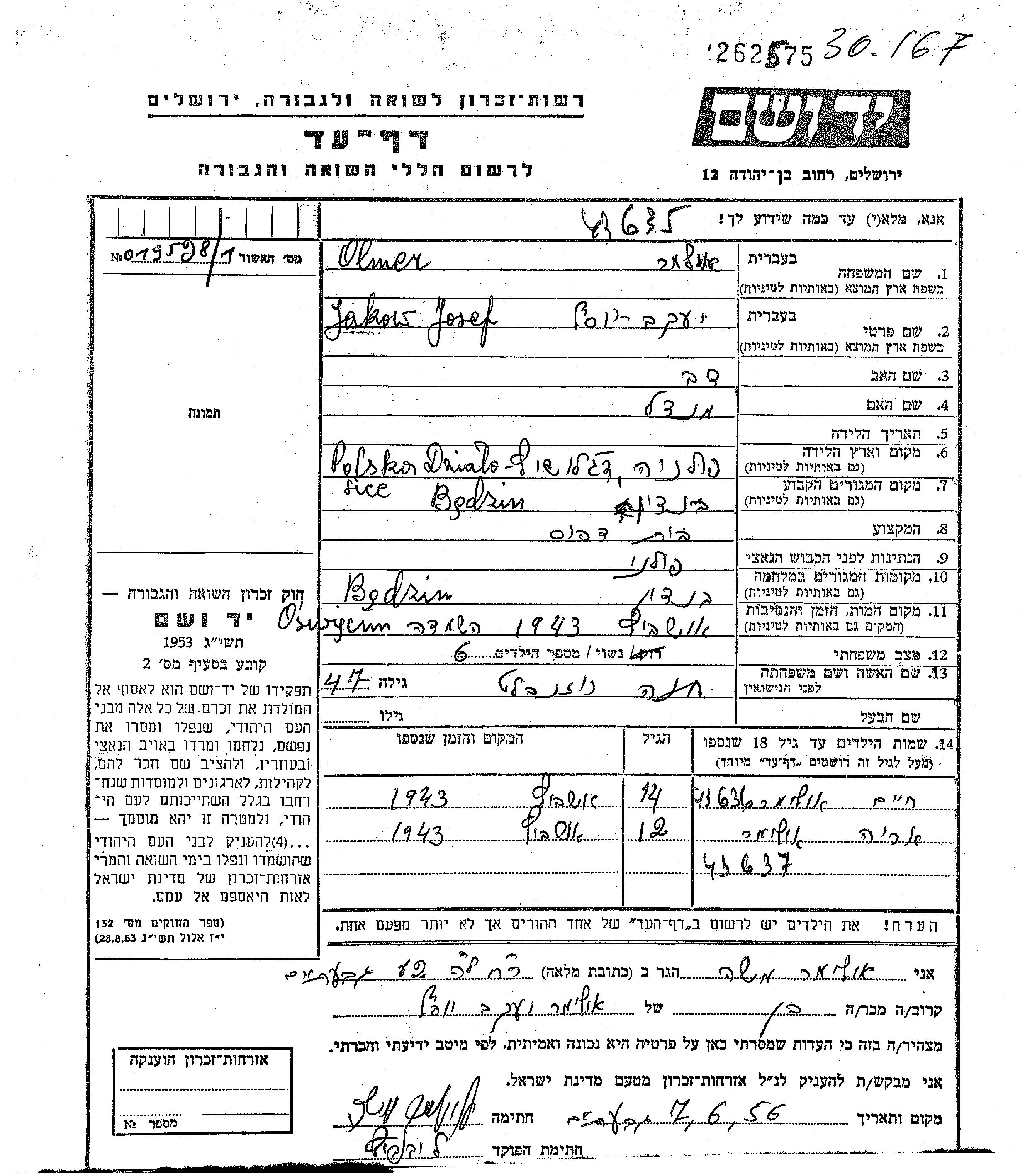 Яков Иосеф Ольмер Ульмер, место рождения: Дзялошице, Польша. Отец: Дов, mать:Мендель. Владелец типографии. Женат / замужем. Место жительства до войны: Бендзин, Польша. Место во время войны: Бендзин, Польша.