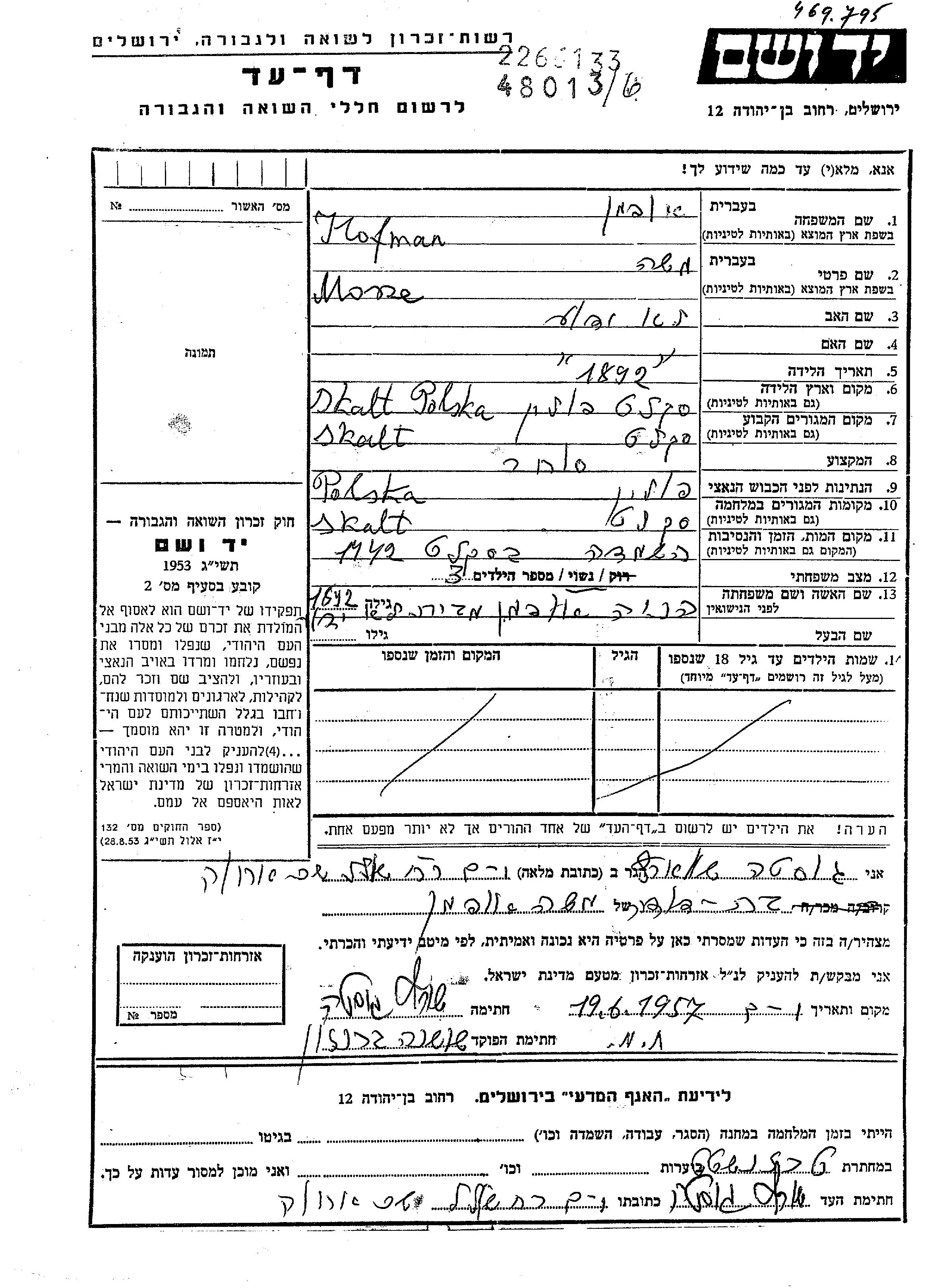 Моше Хофман Офман, место рождения: Скалат, Польша. Торговец / торговка. Женат / замужем. Место жительства до войны: Скалат, Польша. Место во время войны: Скалат, Польша.