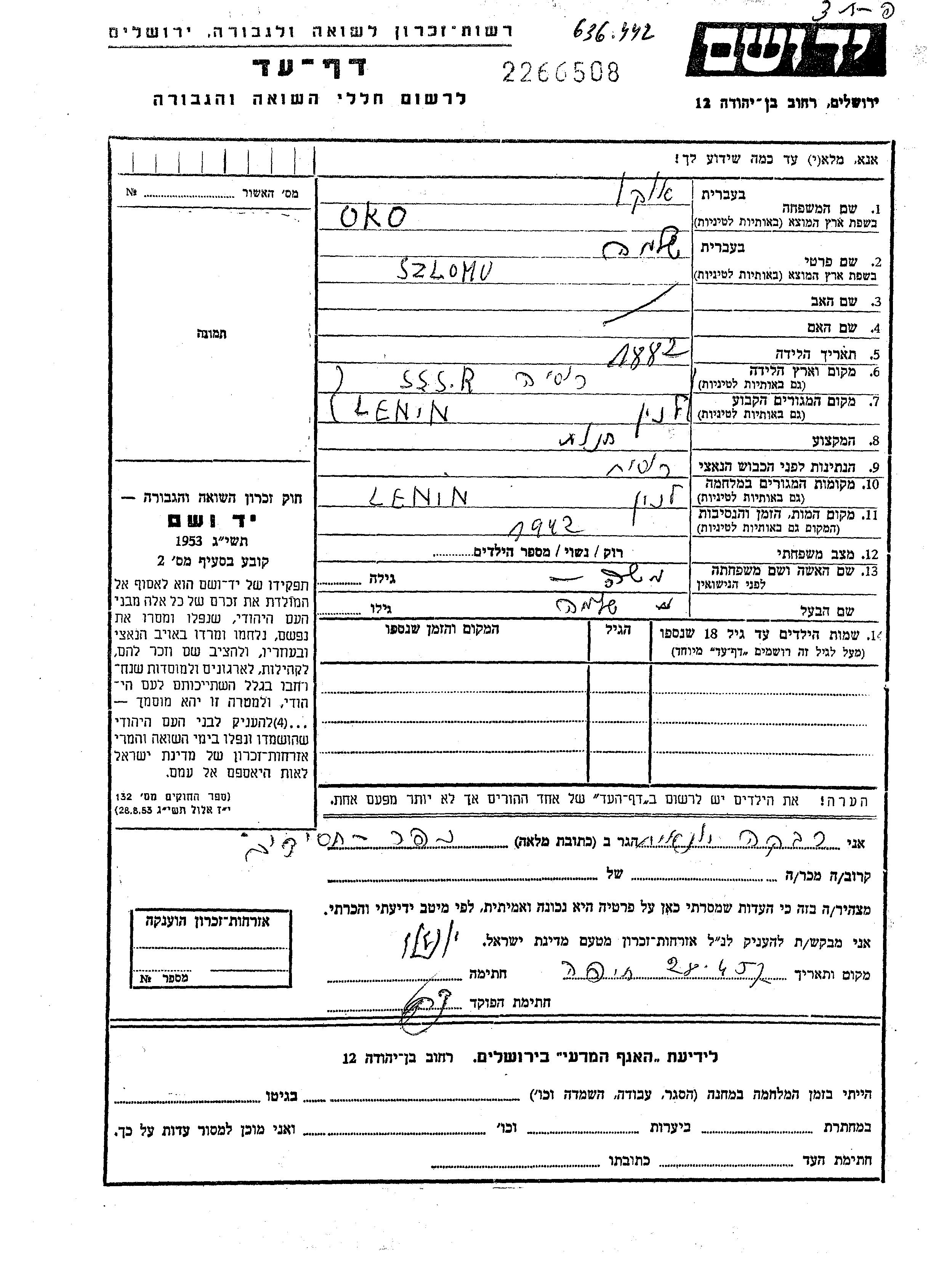 Шломо Око, место рождения: Ленин, Польша. Владелец / владелица магазина. Женат / замужем. Место жительства до войны: Ленин, Польша. Место во время войны: Ленин, Польша.