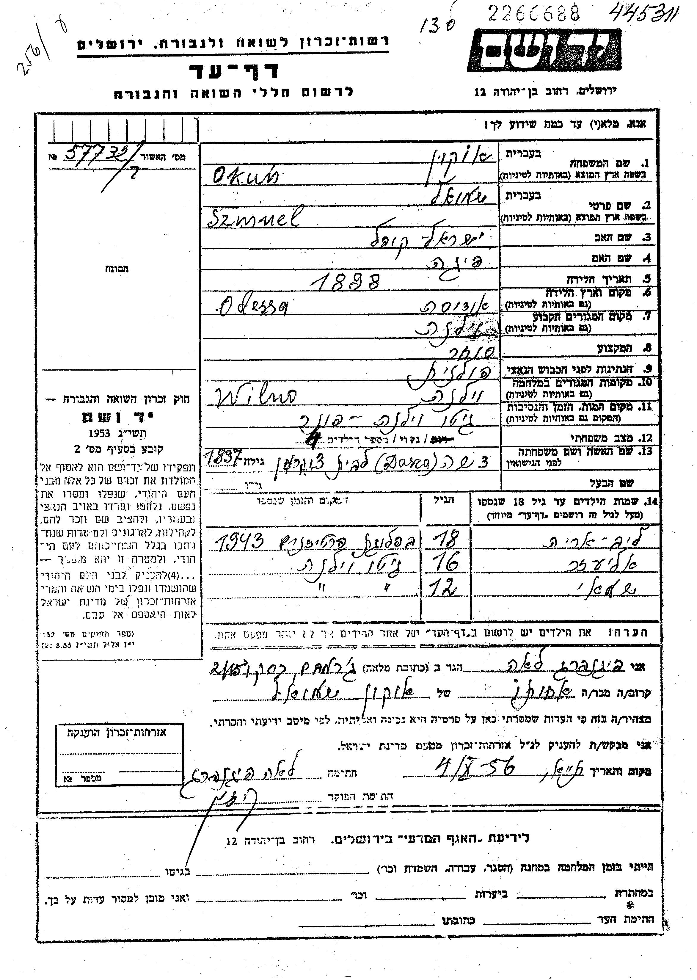 Шмуэль Окунь, место рождения: Одесса, Украина (СССР). Отец: Исраэль Яков, mать:Фейга. Торговец / торговка. Женат / замужем. Место жительства до войны: Вильно, Польша. Место во время войны: Вильно, Польша.
