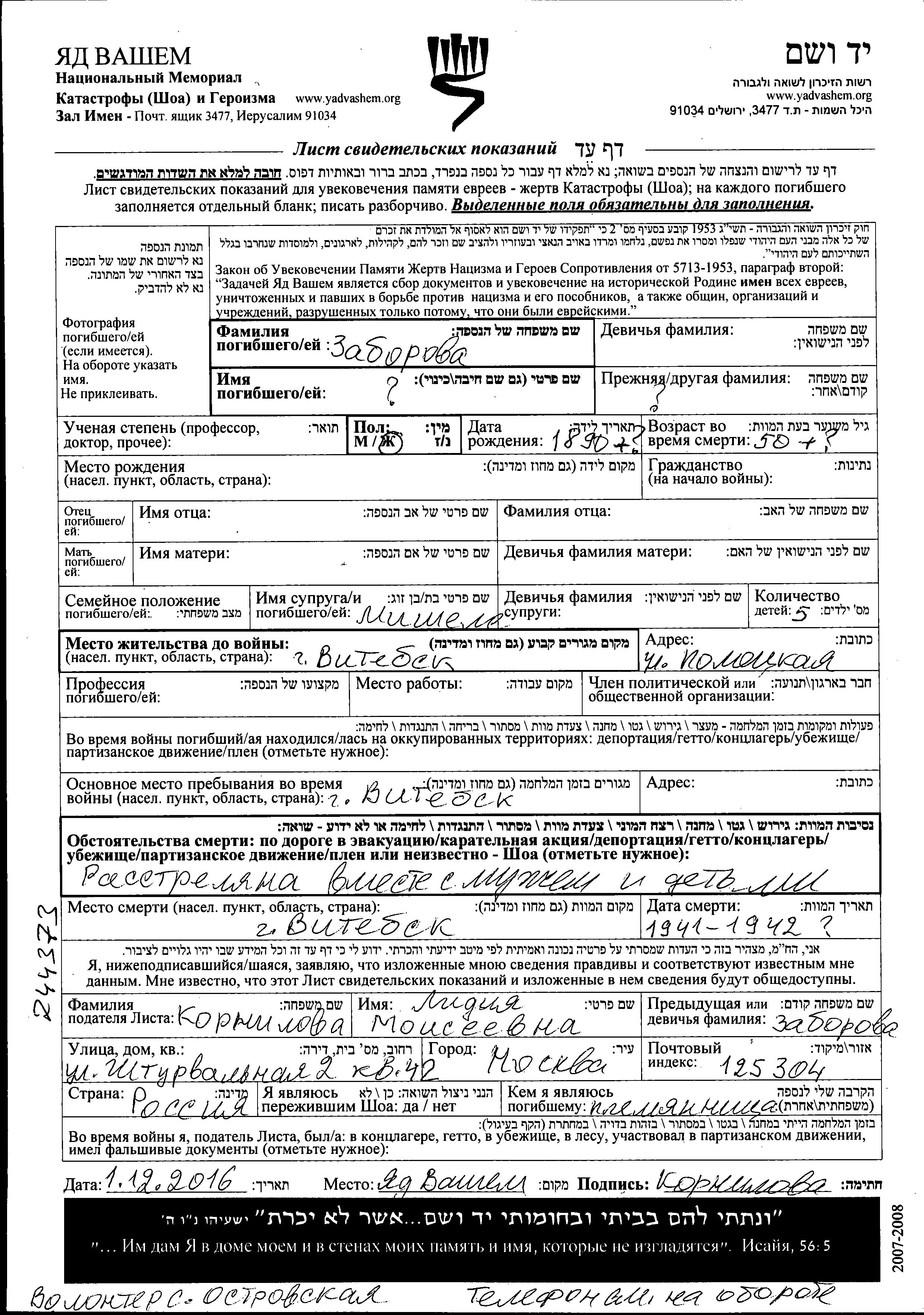 Яд Вашем - Листы свидетельских показаний Мемориального фонда