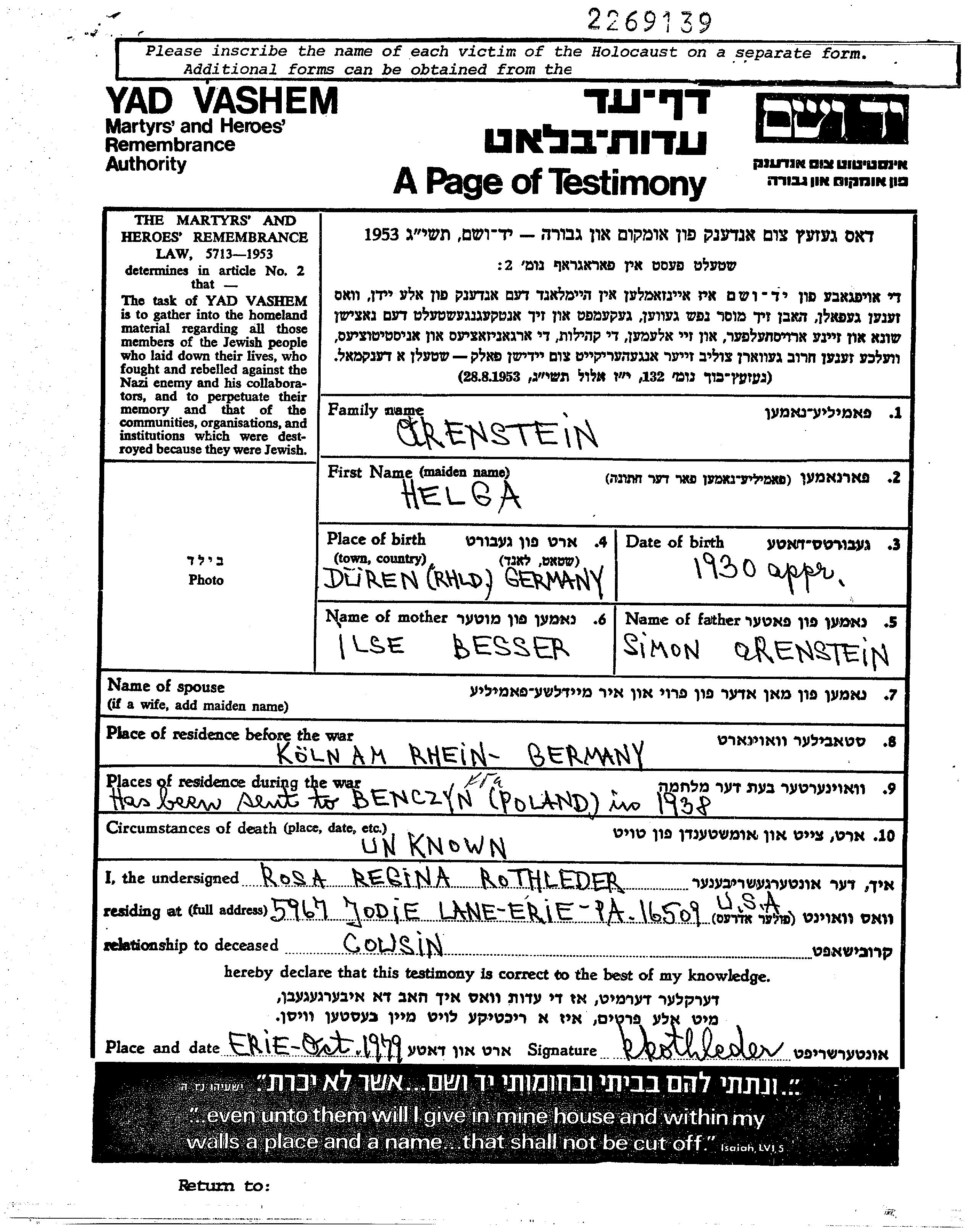 Оренштейн Хельга 1930 Кёльн, Германия Лист свидетельских показаний