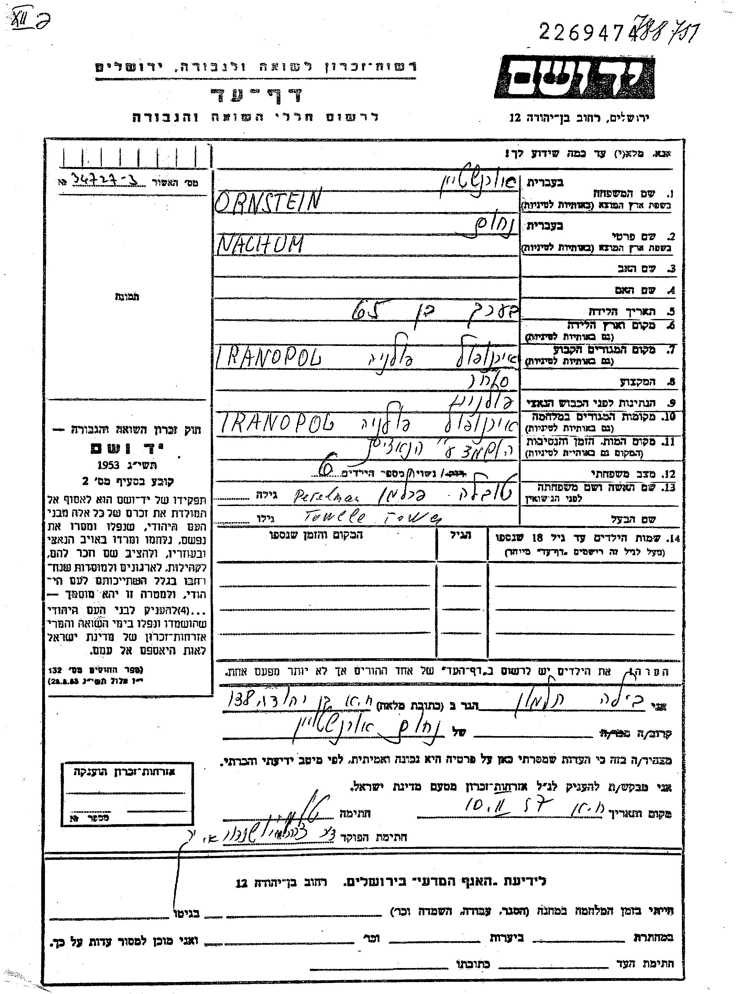 Орнштайн Нахум Тарнополь, Польша Лист свидетельских показаний