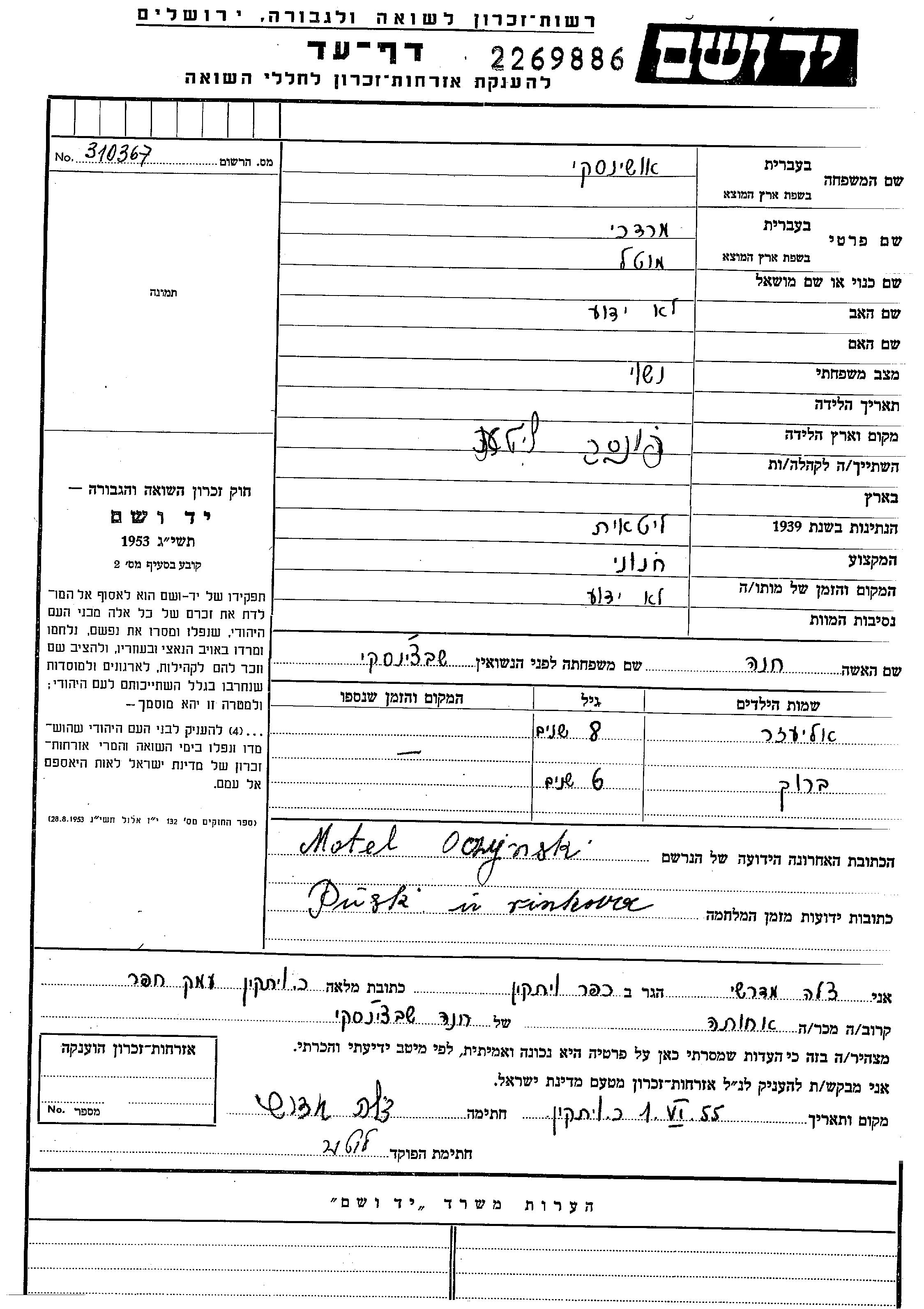 Мотел Ошински. Владелец / владелица магазина. Женат / замужем. Место жительства до войны: Пинск, Польша.