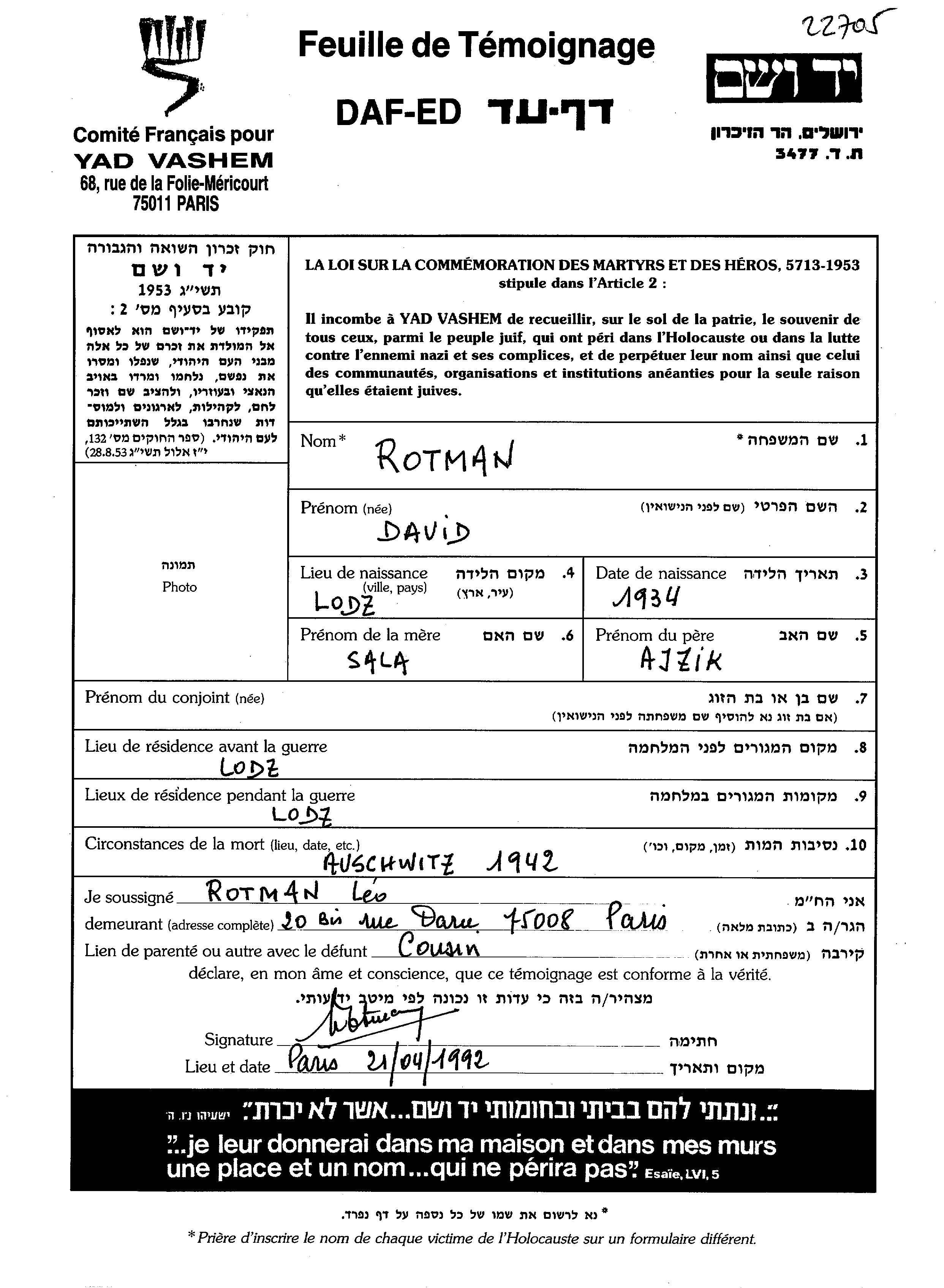 Ротман Давид 1934 Лодзь, Польша Лист свидетельских показаний