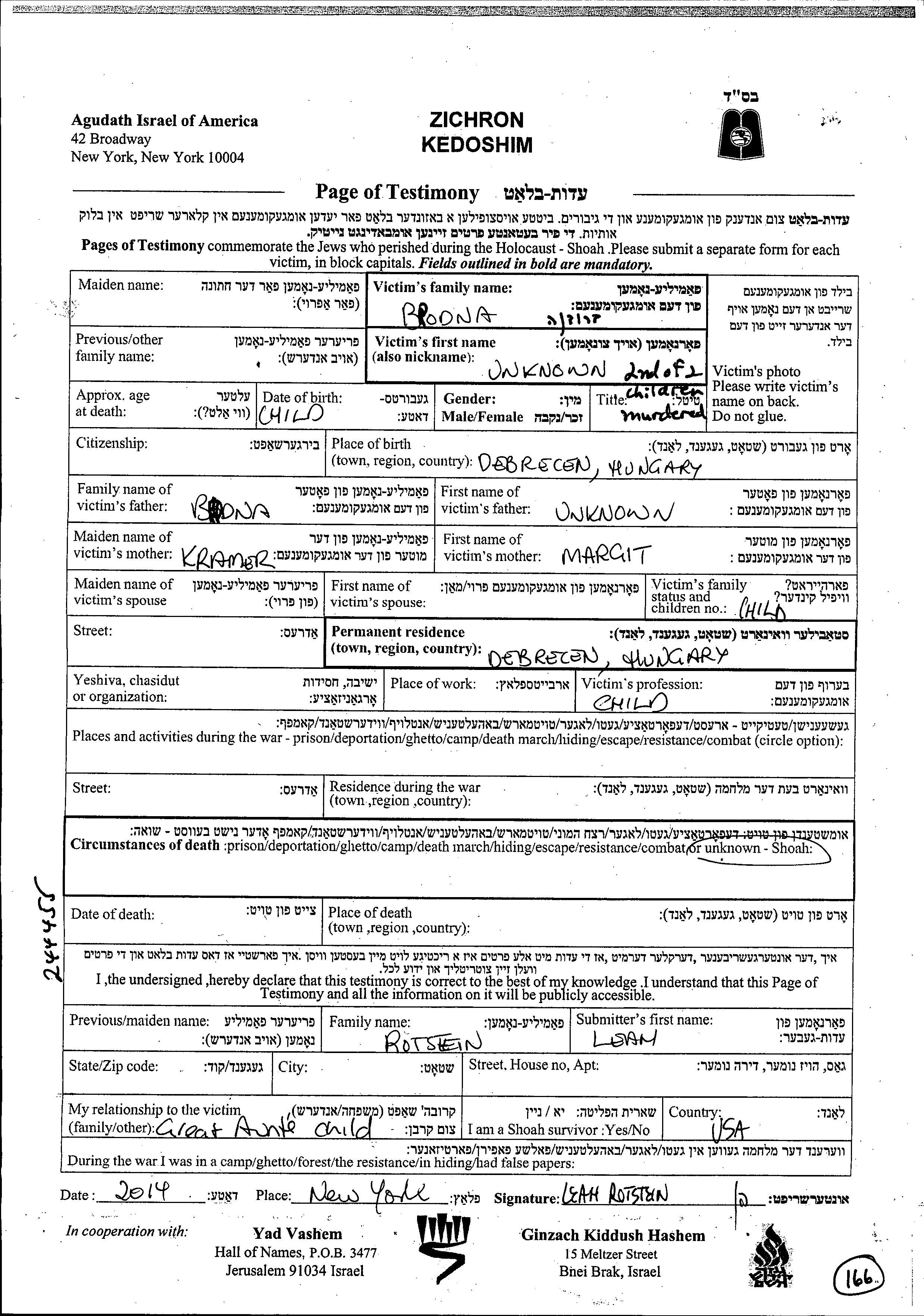 Бродна Имя неизвестно Дебрецен, Венгрия Лист свидетельских показаний
