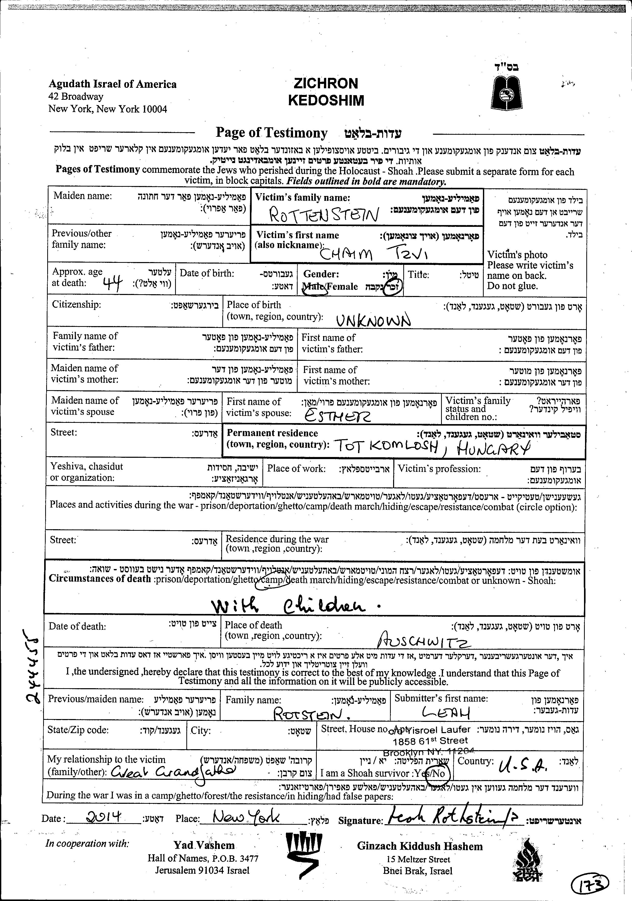 Хаим Цви Роттенштайн. Женат / замужем. Место жительства до войны: Тоткомлош, Венгрия.