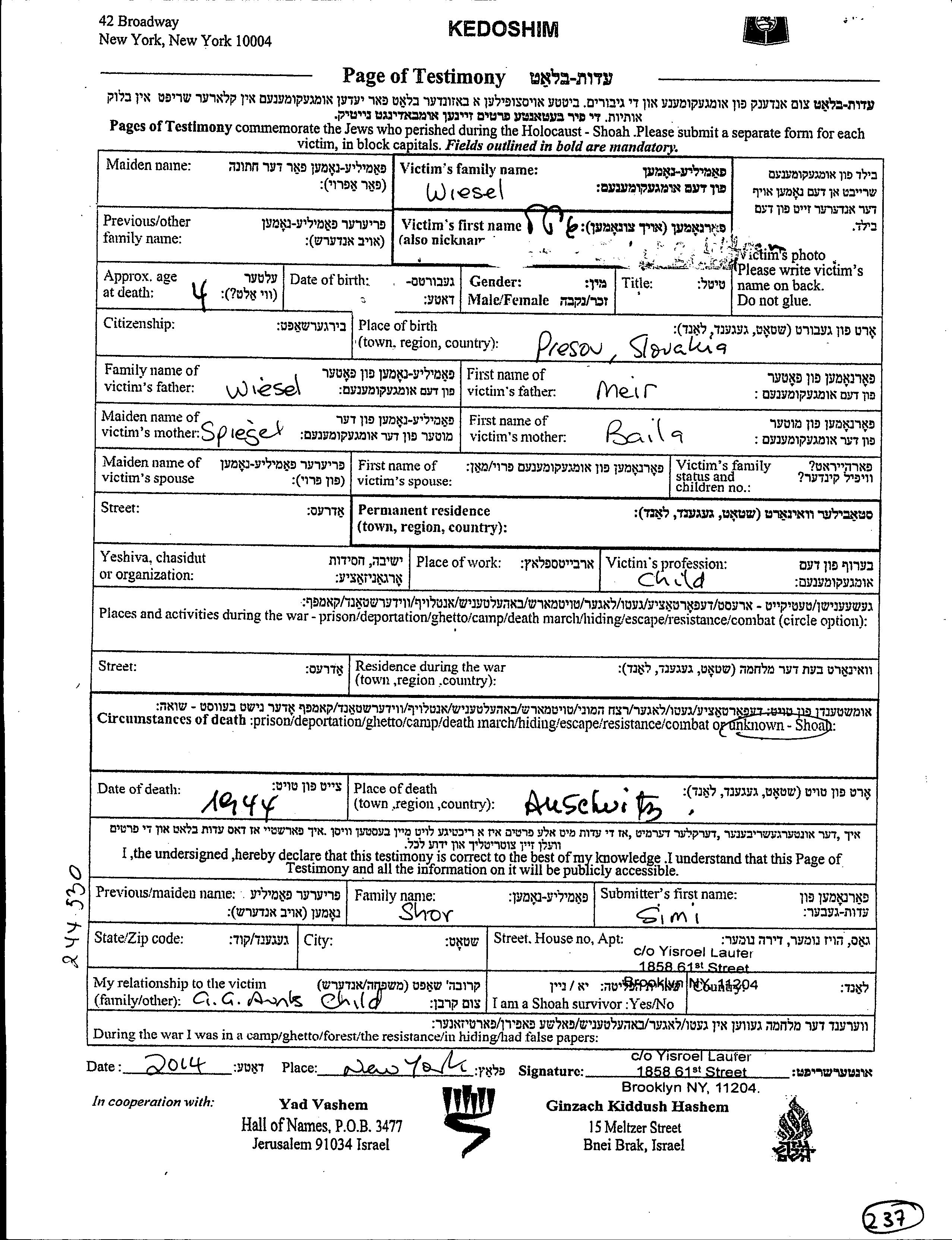 Гитель Визель, место рождения: Прешов, Чехословакия. Отец: Меир, mать:Баила, девичья фамилия Шпигель. Ребенок.