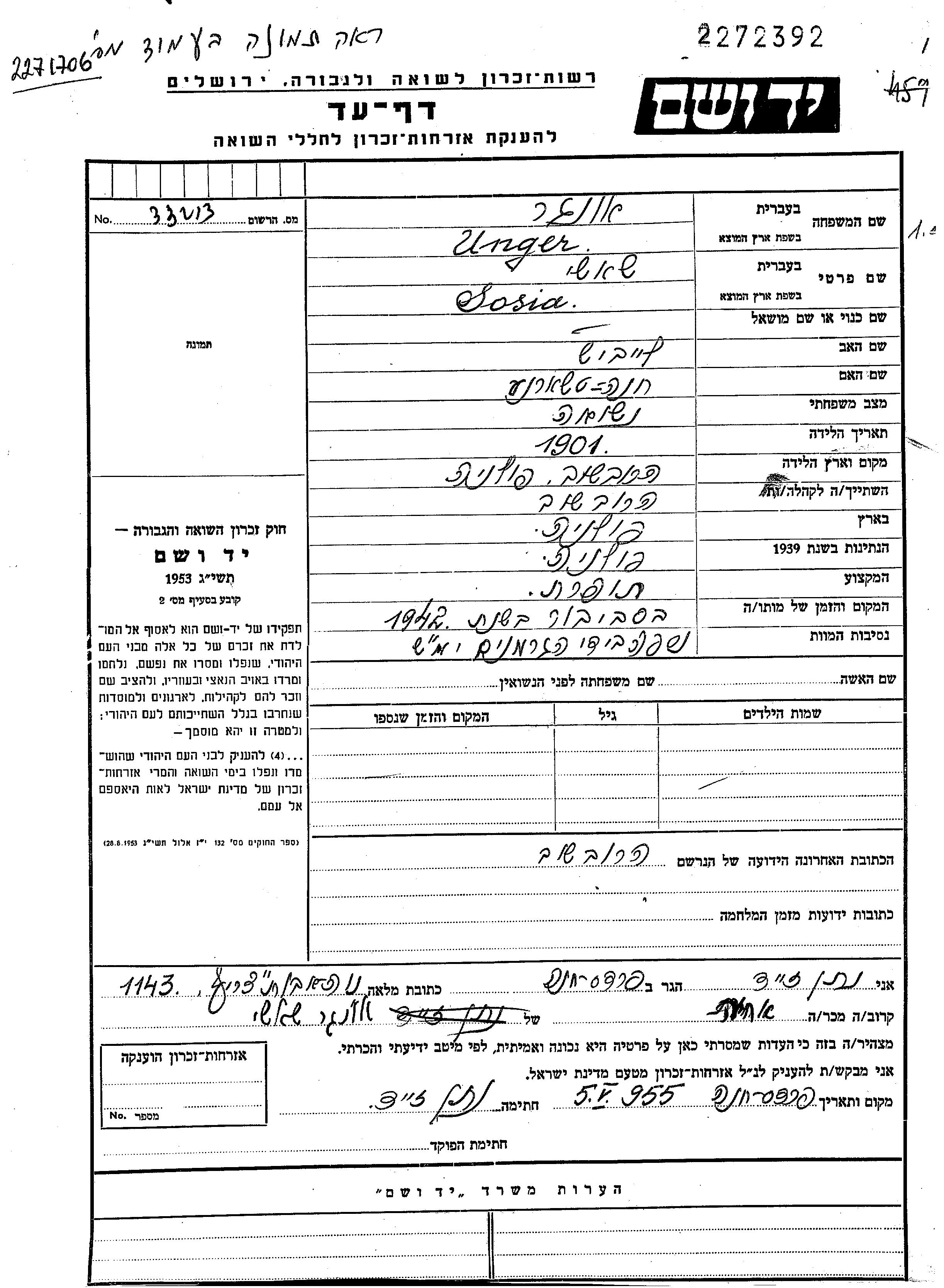 Сосия Унгар, девичья фамилия Зейд, место рождения: Хрубешув, Польша. Отец: Лейбиш, mать:Хана Чарна. Швея. Женат / замужем. Место жительства до войны: Хрубешув, Польша. Место во время войны: Хрубешув, Польша.
