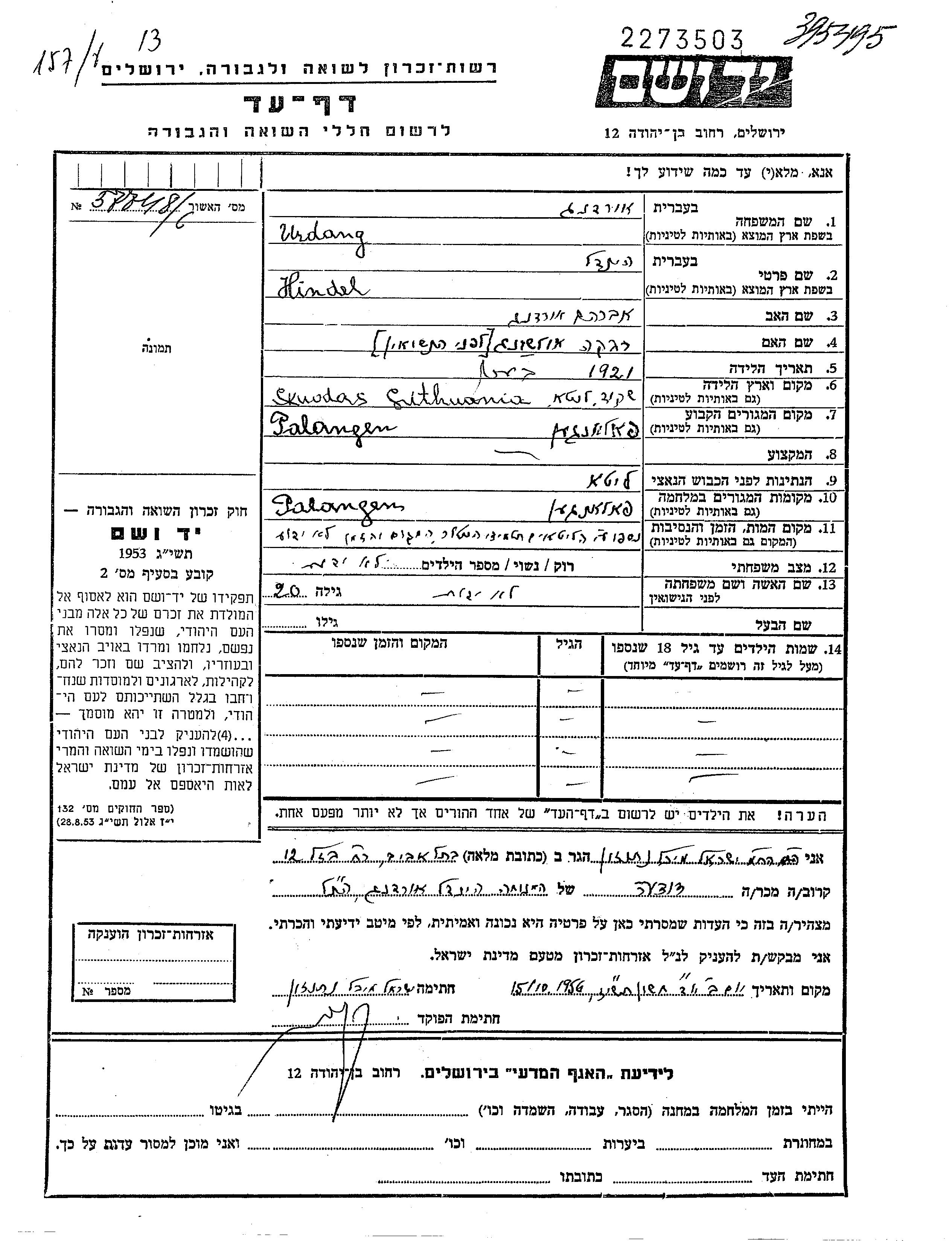 Хиндель Урданг, место рождения: Скуодас, Литва. Отец: Авраам, mать:Ривка, девичья фамилия Ольшванг. Женат / замужем. Место жительства до войны: Паланга, Литва. Место во время войны: Паланга, Литва.