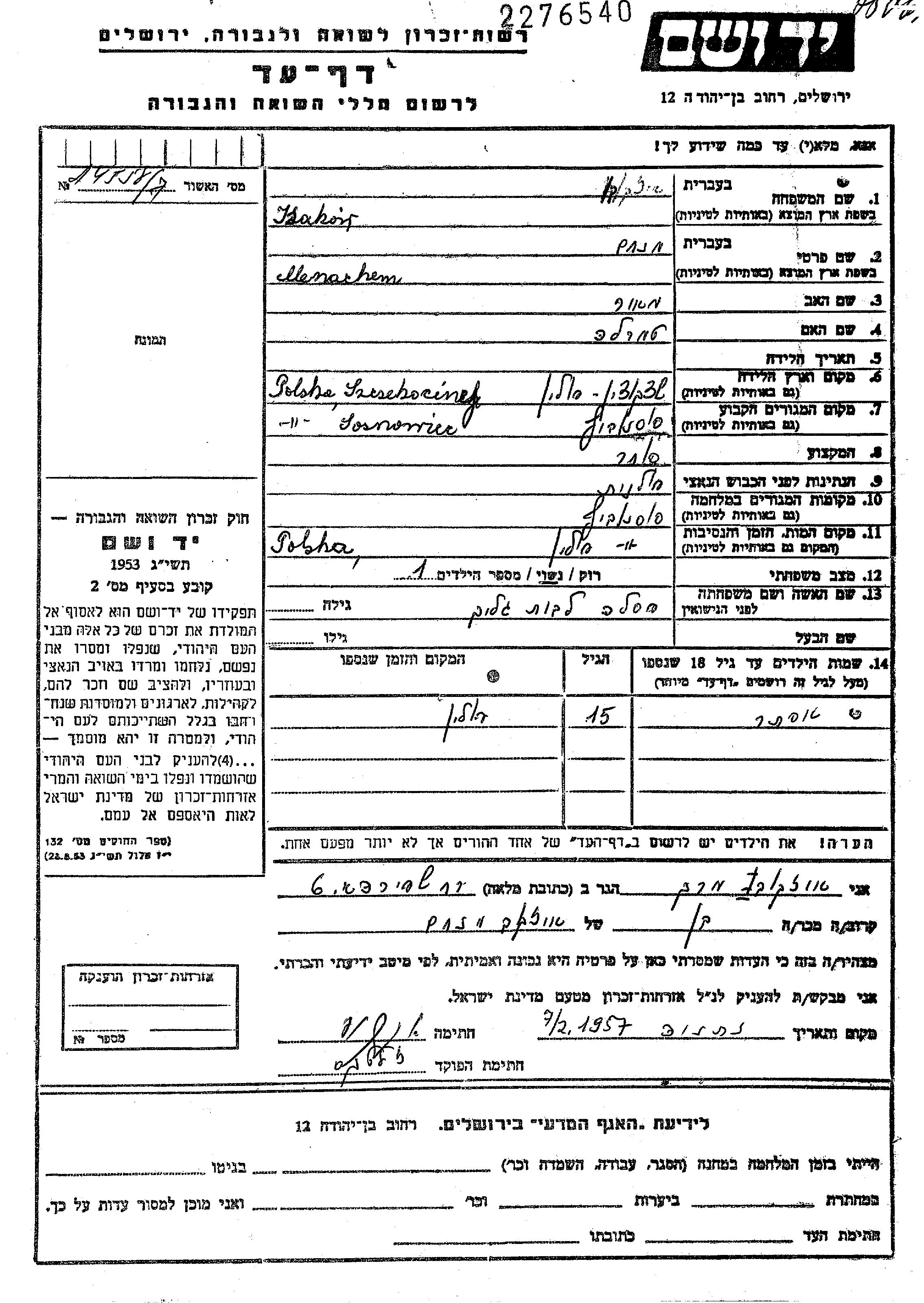 Изаков Менахем Сосновец, Польша Лист свидетельских показаний