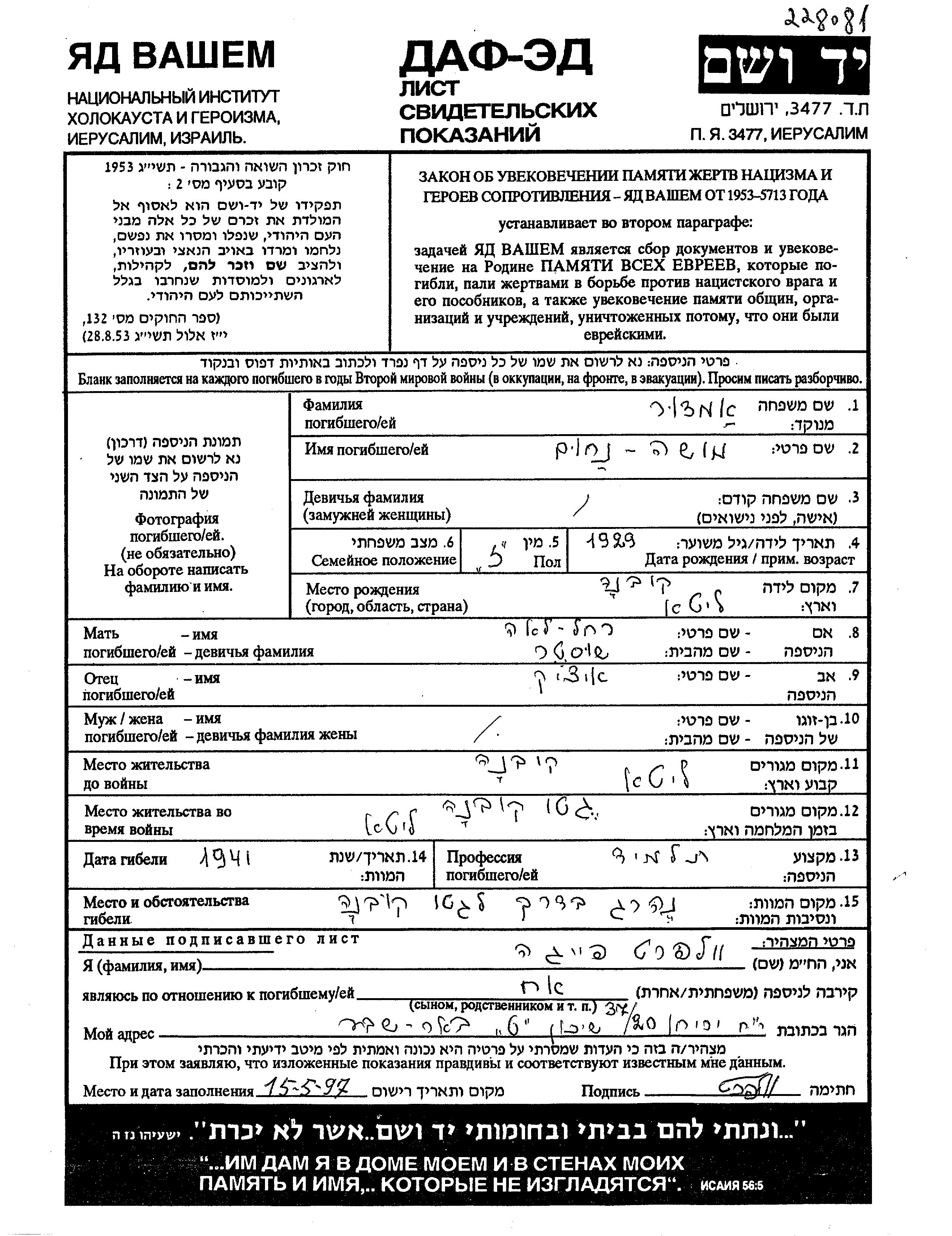 Яд Вашем - Листы свидетельских показаний Мемориального фонда