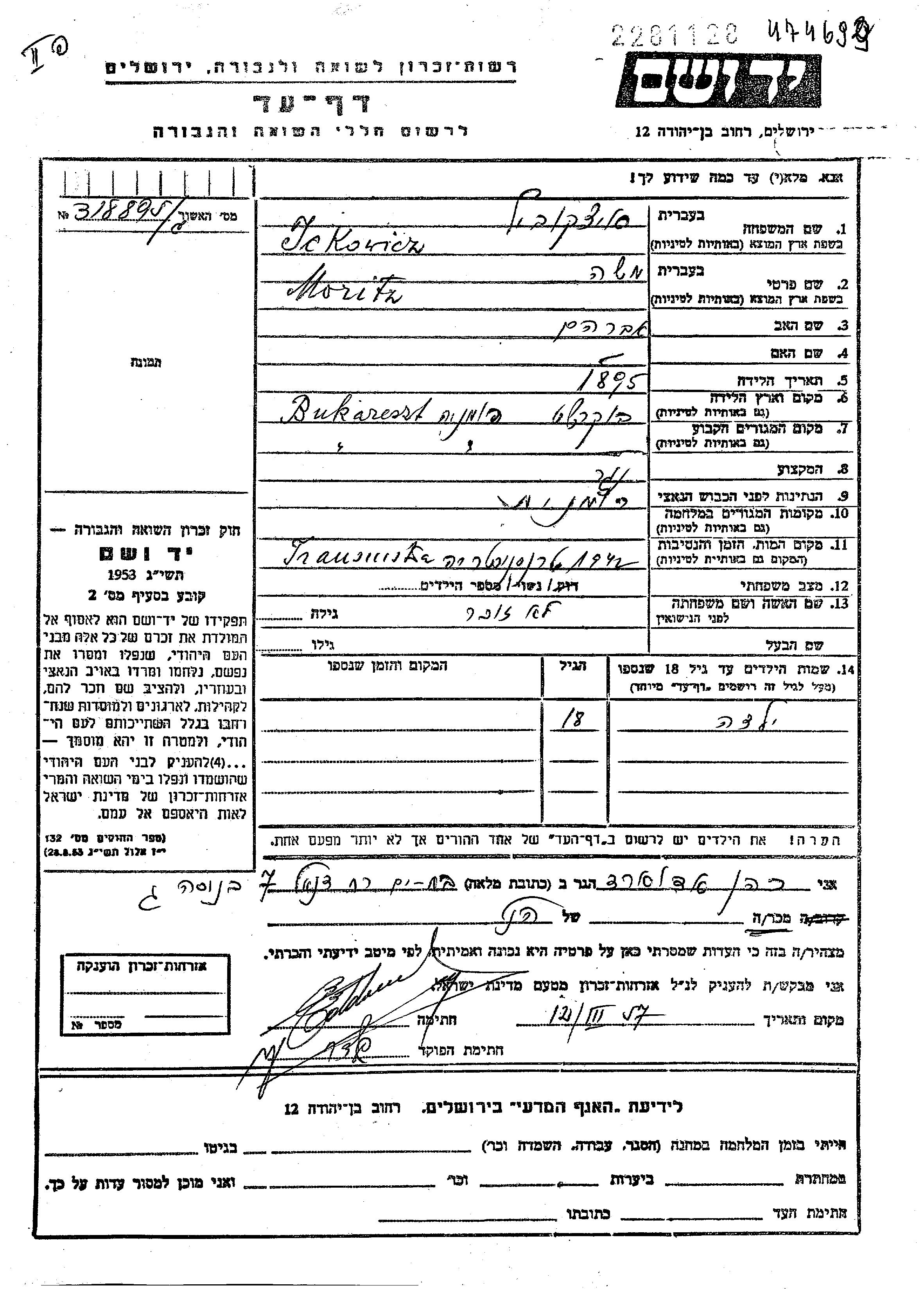 Ицкович Мориц Моше 1895 Бухарест, Румыния Лист свидетельских показаний